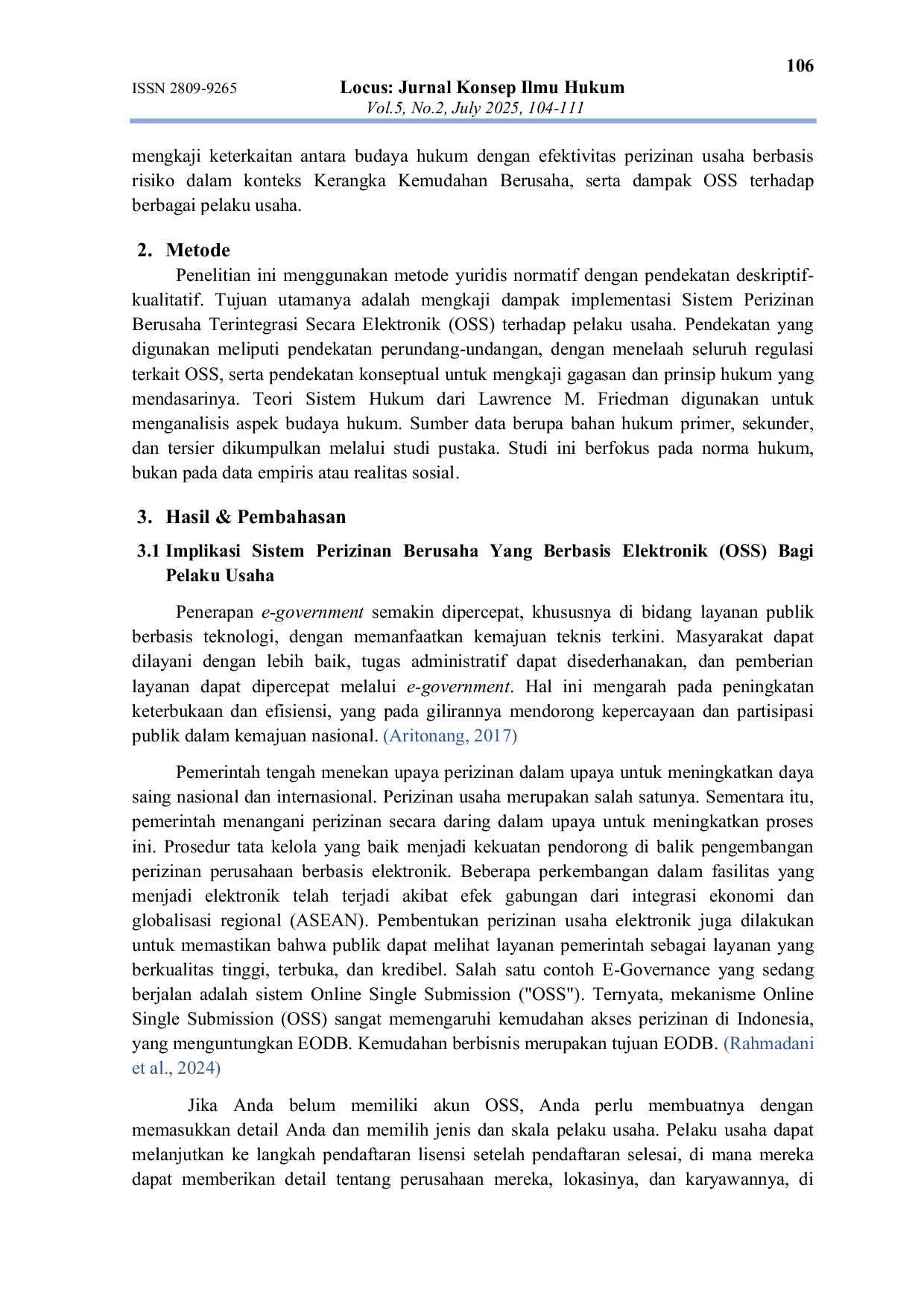 Locus: Jurnal Konsep Ilmu HukumLocus: Jurnal Konsep Ilmu HukumPelaku usaha menjadi fokus kajian ini, yang mengkaji tentang konsekuensi OSS berbasis elektronik. Dengan tujuan untuk memudahkan operasional perusahaan yang terkait hukum, penelitian ini akan mengkaji dampak Perizinan Usaha Berbasis Risiko dan konsekuensi Online Single Submission (OSS) terhadap berbagai pelaku usaha. Kajian ini membahas tentang penelitian hukum normatif. Temuan kajian ini menjelaskan implikasi OSS bagi pelaku usaha, yang akan memperoleh manfaat dari peningkatan layanan perizinan yang lebih mudah diakses dari mana saja (rumah atau kantor) dan memungkinkan pengunggahan semua dokumen yang diperlukan secara elektronik. Selain itu, pengetahuan masyarakat tentang pentingnya menaati hukum dan sikap serta profesionalisme penegak hukum dalam menjalankan tugasnya merupakan indikator keberhasilan Perizinan Usaha Berbasis Risiko dalam konteks Kemudahan Berusaha yang terkait dengan budaya hukum. Karena sistem yang terintegrasi ini mampu memberikan keterbukaan informasi kepada publik dan membatasi peluang terjadinya KKN dalam Perizinan Berusaha, OSS berfungsi sebagai media penyelesaian sengketa antara pelaku usaha dengan otoritas pemerintah.