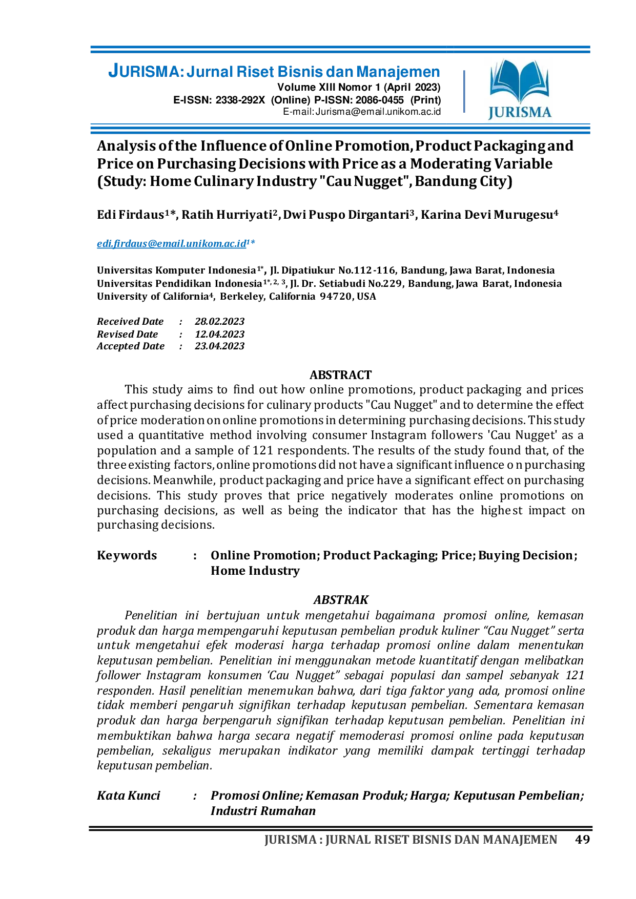 JURISMA : Jurnal Riset Bisnis & ManajemenJURISMA : Jurnal Riset Bisnis & ManajemenThis study aims to find out how online promotions, product packaging and prices affect purchasing decisions for culinary products Cau Nugget and to determine the effect of price moderation on online promotions in determining purchasing decisions. This study used a quantitative method involving consumer Instagram followers Cau Nugget as a population and a sample of 121 respondents. The results of the study found that, of the three existing factors, online promotions did not have a significant influence on purchasing decisions. Meanwhile, product packaging and price have a significant effect on purchasing decisions. This study proves that price negatively moderates online promotions on purchasing decisions, as well as being the indicator that has the highest impact on purchasing decisions.