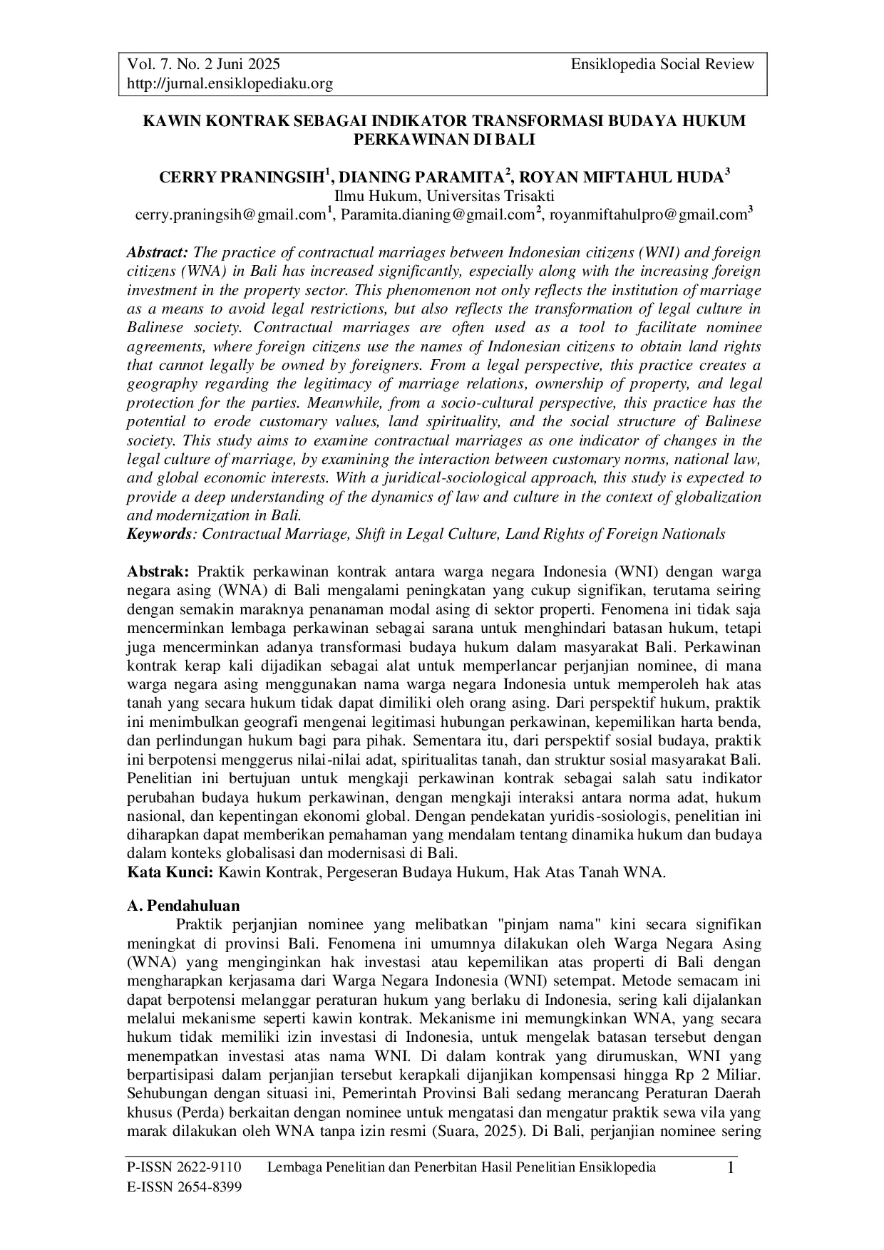 Ensiklopedia Social ReviewEnsiklopedia Social ReviewPraktik perkawinan kontrak antara warga negara Indonesia (WNI) dengan warga negara asing (WNA) di Bali mengalami peningkatan yang cukup signifikan, terutama seiring dengan semakin maraknya penanaman modal asing di sektor properti. Fenomena ini tidak saja mencerminkan lembaga perkawinan sebagai sarana untuk menghindari batasan hukum, tetapi juga mencerminkan adanya transformasi budaya hukum dalam masyarakat Bali. Perkawinan kontrak kerap kali dijadikan sebagai alat untuk memperlancar perjanjian nominee, di mana warga negara asing menggunakan nama warga negara Indonesia untuk memperoleh hak atas tanah yang secara hukum tidak dapat dimiliki oleh orang asing. Dari perspektif hukum, praktik ini menimbulkan geografi mengenai legitimasi hubungan perkawinan, kepemilikan harta benda, dan perlindungan hukum bagi para pihak. Sementara itu, dari perspektif sosial budaya, praktik ini berpotensi menggerus nilai-nilai adat, spiritualitas tanah, dan struktur sosial masyarakat Bali. Penelitian ini bertujuan untuk mengkaji perkawinan kontrak sebagai salah satu indikator perubahan budaya hukum perkawinan, dengan mengkaji interaksi antara norma adat, hukum nasional, dan kepentingan ekonomi global. Dengan pendekatan yuridis-sosiologis, penelitian ini diharapkan dapat memberikan pemahaman yang mendalam tentang dinamika hukum dan budaya dalam konteks globalisasi dan modernisasi di Bali.