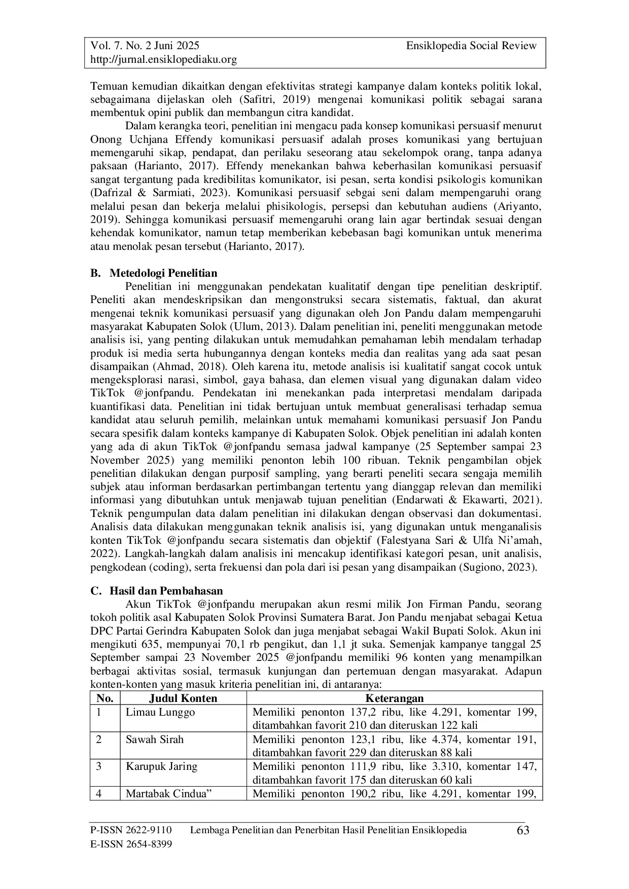 Ensiklopedia Social ReviewEnsiklopedia Social ReviewPerkembangan teknologi digitalisasi atau era 4.0 telah mengubah lanskap kampanye politik di Indonesia, salah satunya dengan penggunaan media sosial (TikTok) sebagai sarana utama dalam membangun citra, meningkatkan kepercayaan dan upaya memenangkan hati pemilih pada pemilihan bupati 2024-2029 di Kabupaten Solok. Tujuan penelitian ini adalah menganalisis teknik komunikasi persuasif dan menganalisis pesan persuasif dalam mempengaruhi persepsi dan preferensi pemilih. Penelitian ini menggunakan pendekatan kualitatif dengan metode analisis isi. Hasil penelitian didapatkan teknik komunikasi persuasif yang dominan digunakan Jon Pandu dalam kampanye politiknya di Kabupaten Solok dalam membangun kredibilitas, kepercayaan, dan dukungan masyarakat dalam mempengaruhi hati pemilih adalah teknik integrasi dan teknik ganjaran, teknik ini dipengaruhi oleh komunikasi Jon Pandu yang menekankan bahwa ia bagian dari masyarakat Kabupaten Solok untuk membangun kampung halamannya lebih baik lagi dan memberikan impak positif kepada yang memilihnya, sehingga teknik tersebut dapat membangun rasa kepercayaan, kedekatan, dan solidaritas. Pesan-pesan persuasif Jon Pandu dirancang secara strategis untuk membentuk citra positif, membangun kedekatan emosional, serta menggugah partisipasi masyarakat Kabupaten Solok melalui pendekatan yang inklusif, bernuansa lokal, dan terhubung dengan kekuatan politik nasional, sehingga menjadi kunci dalam mempengaruhi persepsi dan preferensi pemilih menjelang Pilkada.