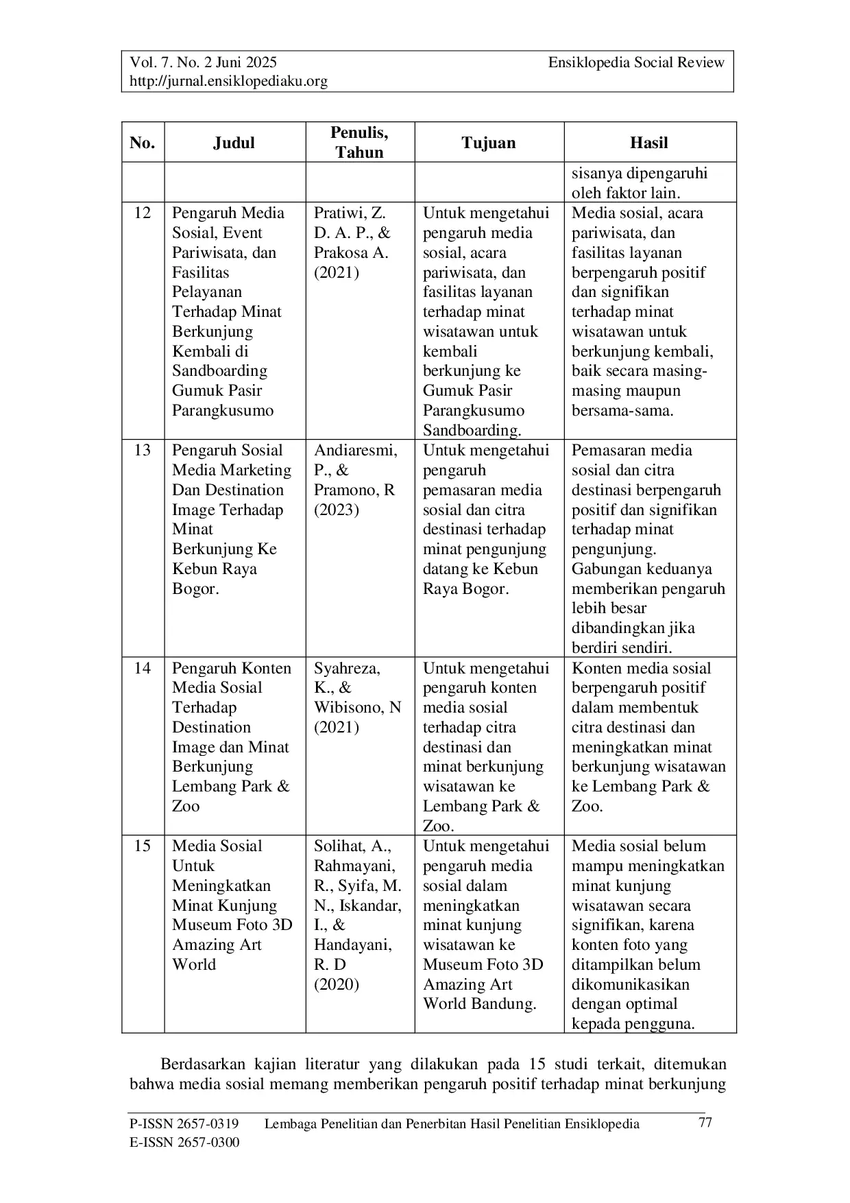 Ensiklopedia Social ReviewEnsiklopedia Social ReviewPenelitian ini bertujuan untuk mengeksplorasi pengaruh media sosial terhadap minat berkunjung wisatawan dengan menggunakan pendekatan Systematic Literature Review (SLR). Melalui analisis terhadap 15 artikel, ditemukan bahwa media sosial memiliki pengaruh positif yang bervariasi antara 6,3% hingga 70,2% terhadap minat berkunjung. Media sosial tidak hanya berfungsi sebagai alat promosi, tetapi juga membentuk persepsi dan ekspektasi wisatawan. Kualitas dan konsistensi konten, serta pemilihan platform seperti Instagram dan YouTube, menjadi faktor kunci dalam efektivitas promosi. Meskipun demikian, tantangan dalam pengelolaan media sosial, seperti keterbatasan sumber daya dan kurangnya strategi konten, masih dihadapi. Penelitian ini merekomendasikan pengelola destinasi untuk meningkatkan konten visual dan berkolaborasi dengan influencer guna memaksimalkan dampak positif terhadap minat kunjung wisatawan.