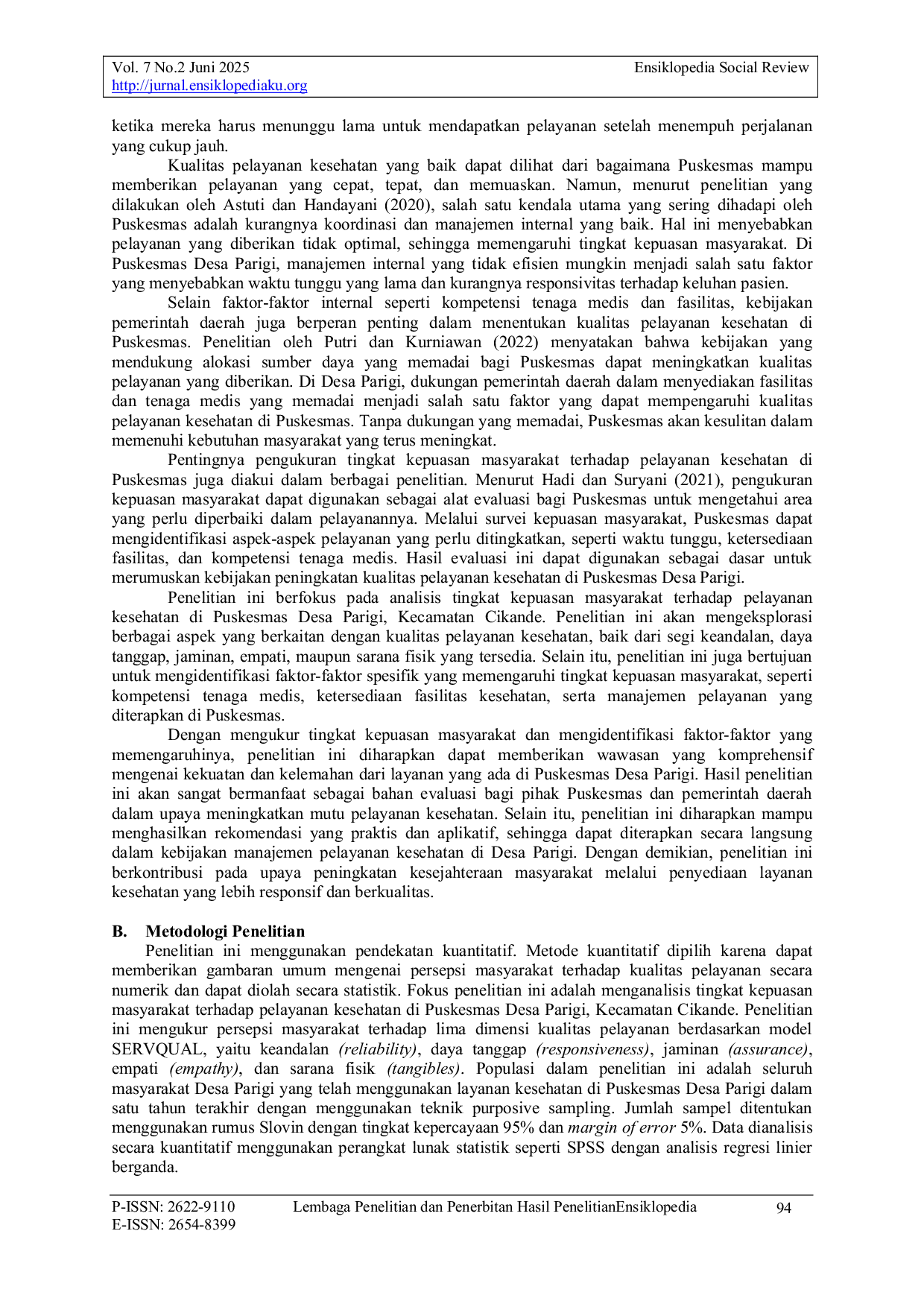 Ensiklopedia Social ReviewEnsiklopedia Social ReviewPenelitian ini bertujuan untuk menganalisis tingkat kepuasan masyarakat terhadap pelayanan kesehatan di Puskesmas Desa Parigi, Kecamatan Cikande, menggunakan model SERVQUAL yang meliputi lima dimensi: Keandalan, Daya Tanggap, Jaminan, Empati, dan Sarana Fisik. Metode penelitian yang digunakan adalah pendekatan kuantitatif dengan penyebaran kuesioner kepada 100 responden. Hasil penelitian menunjukkan bahwa dimensi Empati memperoleh skor tertinggi (63%), mengindikasikan bahwa perhatian tenaga kesehatan terhadap kebutuhan khusus pasien menjadi kekuatan utama dalam pelayanan. Dimensi Sarana Fisik dan Keandalan masing-masing mendapatkan skor 61%, yang mencerminkan bahwa fasilitas fisik dan konsistensi pelayanan sudah cukup memadai, meskipun masih ada ruang untuk perbaikan. Dimensi Daya Tanggap mencatat skor 60%, dengan perhatian khusus pada peningkatan komunikasi terkait prosedur pelayanan. Dimensi Jaminan memperoleh skor terendah (59%), yang menunjukkan bahwa aspek perlindungan kerahasiaan informasi dan rasa aman pasien perlu ditingkatkan. Secara keseluruhan, pelayanan kesehatan di Puskesmas Desa Parigi telah memberikan tingkat kepuasan yang cukup baik, tetapi masih membutuhkan perbaikan pada beberapa aspek, seperti konsistensi pelayanan, perlindungan privasi, dan kenyamanan fasilitas fisik. Temuan ini memberikan implikasi praktis berupa rekomendasi peningkatan manajemen operasional, pelatihan komunikasi, serta renovasi fasilitas fisik untuk meningkatkan kualitas pelayanan kesehatan.