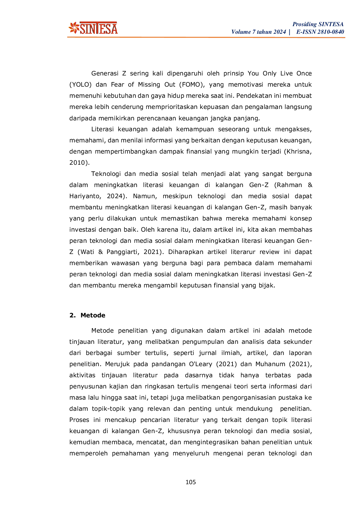 Seminar Ilmiah Nasional Teknologi, Sains, dan Sosial Humaniora (SINTESA)Seminar Ilmiah Nasional Teknologi, Sains, dan Sosial Humaniora (SINTESA)Kurangnya literasi keuangan di kalangan masyarakat Indonesia, termasuk Gen-Z, telah menjadi masalah yang signifikan dalam pengambilan keputusan keuangan. Hal ini dapat menimbulkan konsekuensi negatif seperti kesulitan dalam merencanakan masa depan keuangan, pengambilan keputusan keuangan yang buruk, dan meningkatnya risiko penipuan keuangan. Oleh karena itu, sangat penting untuk meningkatkan literasi keuangan di kalangan Gen-Z agar mereka dapat membuat keputusan keuangan yang bijak dan meningkatkan kesejahteraan finansial mereka. Tujuan utama dari artikel ini adalah untuk menekankan peran penting teknologi dan media sosial dalam meningkatkan literasi keuangan bagi Gen-Z. Pendekatan yang digunakan dalam artikel ini adalah metode tinjauan literatur, yang mencakup berbagai teknik pengumpulan data literatur, membaca dan mencatat, serta mengelola bahan penelitian. Hasil dari artikel ini adalah mengetahui bahwa teknologi dan media sosial berperan penting dalam meningkatkan literasi keuangan bagi Gen-Z.