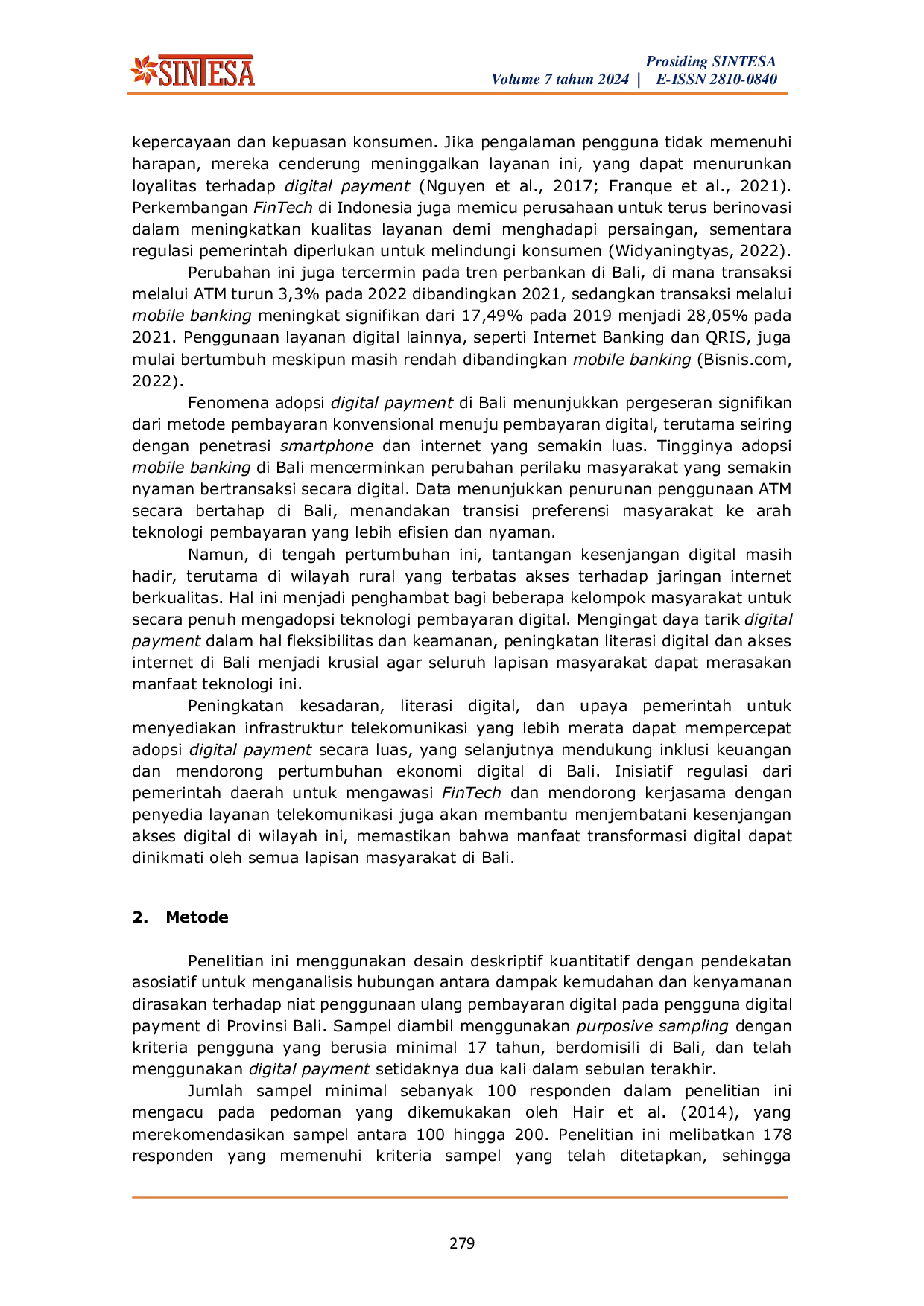 Seminar Ilmiah Nasional Teknologi, Sains, dan Sosial Humaniora (SINTESA)Seminar Ilmiah Nasional Teknologi, Sains, dan Sosial Humaniora (SINTESA)Penelitian ini bertujuan untuk menganalisis pengaruh Persepsi Kemudahan Penggunaan terhadap Niat Penggunaan Ulang yang dimediasi oleh Kenyamanan Dirasakan dalam penggunaan digital payment oleh masyarakat di Provinsi Bali. Dengan menggunakan desain deskriptif kuantitatif dan pendekatan asosiatif, penelitian ini melibatkan 178 responden yang dipilih melalui teknik purposive sampling. Responden terdiri dari pengguna digital payment berusia minimal 17 tahun, berdomisili di Bali, dan telah menggunakan layanan tersebut setidaknya dua kali dalam sebulan terakhir. Pengujian data dilakukan dengan metode Partial Least Squares (PLS). Hasil penelitian menunjukkan bahwa Persepsi Kemudahan Penggunaan memiliki pengaruh positif yang signifikan terhadap Kenyamanan Dirasakan, yang pada gilirannya memediasi hubungan antara Persepsi Kemudahan Penggunaan dan Niat Penggunaan Ulang. Nilai koefisien jalur untuk pengaruh mediasi menunjukkan adanya Complementary (partial mediation), yang berarti Kenyamanan Dirasakan berperan penting dalam mendorong niat pengguna untuk tetap menggunakan digital payment. Penelitian ini juga menemukan bahwa adopsi digital payment di Bali terus tumbuh, meskipun tantangan berupa kesenjangan digital di beberapa wilayah masih perlu diatasi. Kesimpulannya, peningkatan literasi digital dan akses internet yang merata diperlukan agar seluruh masyarakat dapat merasakan manfaat inklusi keuangan dari digital payment.