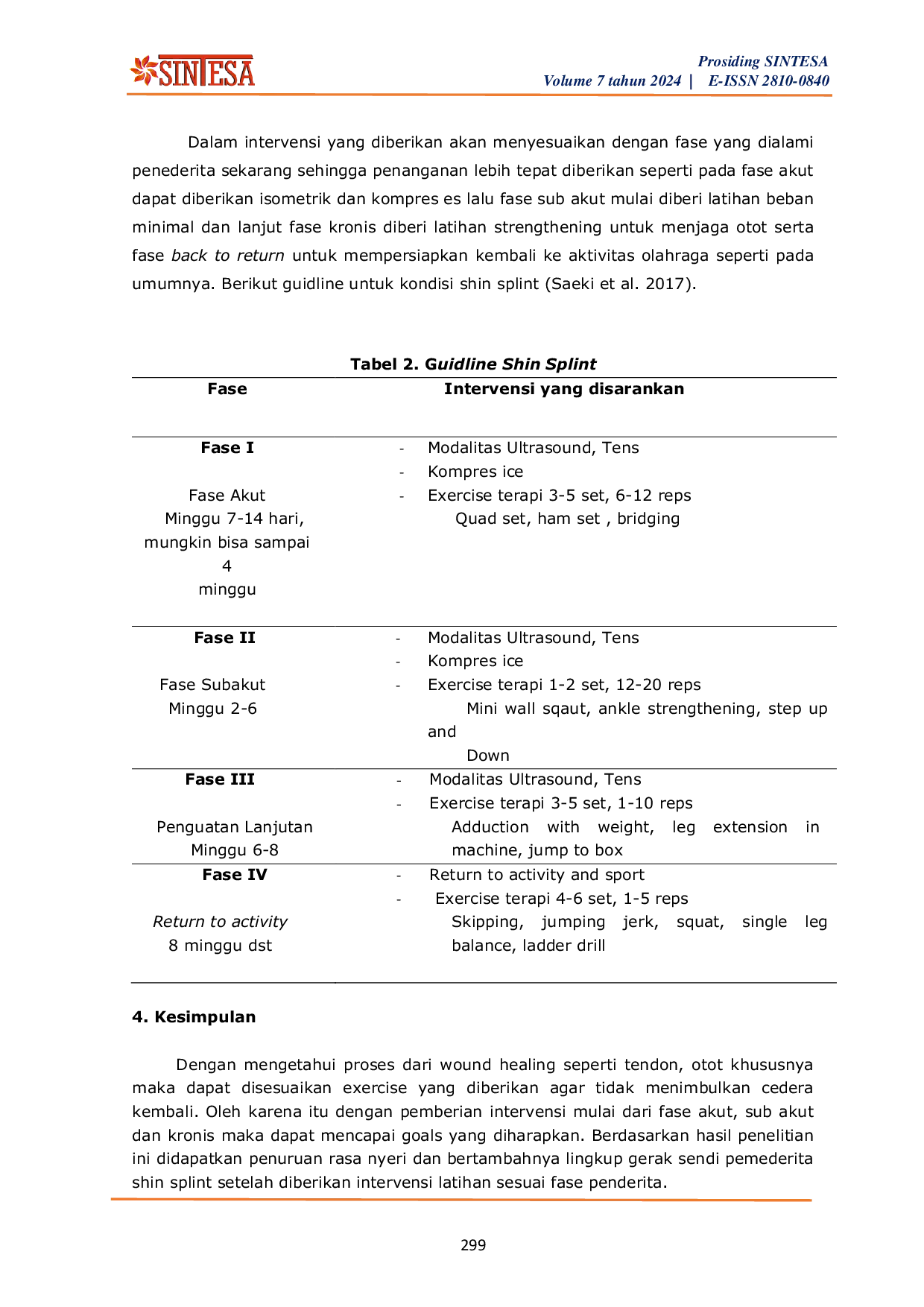 Dengan mengetahui proses dari wound healing seperti tendon, otot khususnya maka dapat disesuaikan exercise yang diberikan agar tidak menimbulkan cedera kembali.Oleh karena itu dengan pemberian intervensi mulai dari fase akut, sub akut dan kronis maka dapat mencapai goals yang diharapkan.Berdasarkan hasil penelitian ini didapatkan penuruan rasa nyeri dan bertambahnya lingkup gerak sendi pemederita shin splint setelah diberikan intervensi latihan sesuai fase penderita.