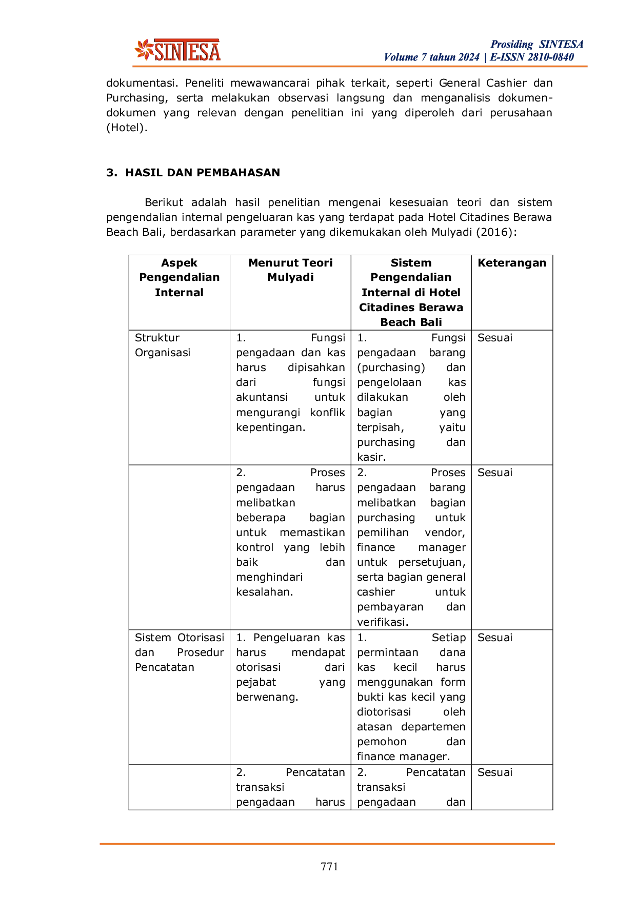 Analisis menunjukkan bahwa Hotel Citadines Berawa Beach Bali telah mengimplementasikan prinsip pengendalian internal dengan baik sesuai teori Mulyadi, terutama dalam pemisahan fungsi pengadaan barang dan pengelolaan kas, serta pencatatan transaksi yang akurat menggunakan perangkat lunak terintegrasi.Meskipun sistem keamanan kas sudah memadai dan kas diasuransikan, terdapat kebutuhan untuk meningkatkan pemisahan penyimpanan kas dari area operasional.Secara keseluruhan, pengendalian internal hotel ini efektif dalam meminimalkan risiko kesalahan dan penyimpangan, serta menjaga akurasi dan keamanan pengelolaan keuangan, meskipun ada ruang untuk perbaikan pada aspek penyimpanan kas.