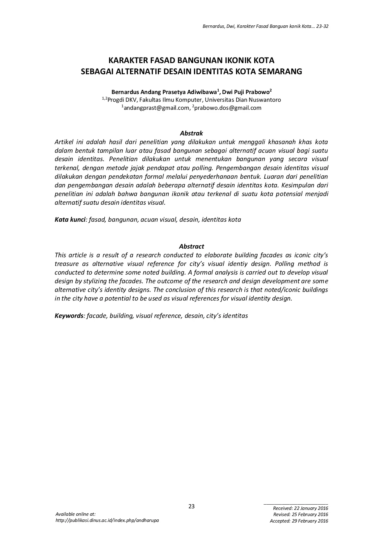 ANDHARUPA: Jurnal Desain Komunikasi Visual & MultimediaANDHARUPA: Jurnal Desain Komunikasi Visual & MultimediaArtikel ini adalah hasil dari penelitian yang dilakukan untuk menggali khasanah khas kota dalam bentuk tampilan luar atau fasad bangunan sebagai alternatif acuan visual bagi suatu desain identitas. Penelitian dilakukan untuk menentukan bangunan yang secara visual terkenal, dengan metode jajak pendapat atau polling. Pengembangan desain identitas visual dilakukan dengan pendekatan formal melalui penyederhanaan bentuk. Luaran dari penelitian dan pengembangan desain adalah beberapa alternatif desain identitas kota. Kesimpulan dari penelitian ini adalah bahwa bangunan ikonik atau terkenal di suatu kota potensial menjadi alternatif suatu desain identitas visual.