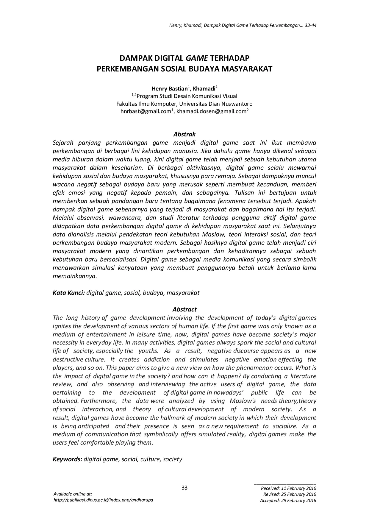 ANDHARUPA: Jurnal Desain Komunikasi Visual & MultimediaANDHARUPA: Jurnal Desain Komunikasi Visual & MultimediaSejarah panjang perkembangan game menjadi digital game saat ini membawa perkembangan di berbagai lini kehidupan manusia. Jika dahulu game hanya dikenal sebagai media hiburan dalam waktu luang, kini digital game telah menjadi sebuah kebutuhan utama masyarakat dalam keseharian. Di berbagai aktivitasnya, digital game selalu mewarnai kehidupan sosial dan budaya masyarakat, khususnya para remaja. Sebagai dampaknya muncul wacana negatif sebagai budaya baru yang merusak seperti membuat kecanduan, memberi efek emosi yang negatif kepada pemain, dan sebagainya. Tulisan ini bertujuan untuk memberikan sebuah pandangan baru tentang bagaimana fenomena tersebut terjadi. Apakah dampak digital game sebenarnya yang terjadi di masyarakat dan bagaimana hal itu terjadi. Melalui observasi, wawancara, dan studi literatur terhadap pengguna aktif digital game didapatkan data perkembangan digital game di kehidupan masyarakat saat ini. Selanjutnya data dianalisis melalui pendekatan teori kebutuhan Maslow, teori interaksi sosial, dan teori perkembangan budaya masyarakat modern. Sebagai hasilnya digital game telah menjadi ciri masyarakat modern yang dinantikan perkembangan dan kehadirannya sebagai sebuah kebutuhan baru bersosialisasi. Digital game sebagai media komunikasi yang secara simbolik menawarkan simulasi kenyataan yang membuat penggunanya betah untuk berlama-lama memainkannya.
