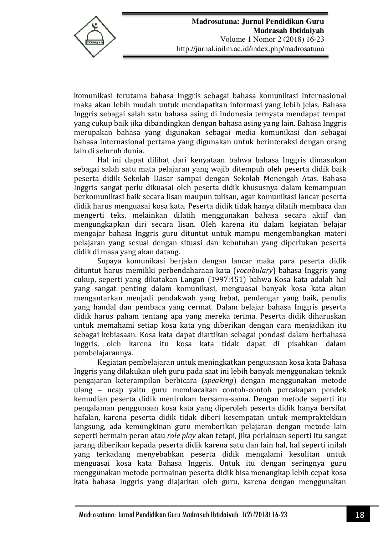 MADROSATUNA : Jurnal Pendidikan Guru Madrasah IbtidaiyahMADROSATUNA : Jurnal Pendidikan Guru Madrasah IbtidaiyahPengaruh kurangnya menggunakan metode permainan dalam mata pelajaran Bahasa Inggris adalah siswa di MI Condong Jamanis memiliki skor rendah dalam penguasaan kosakata bahasa Inggris.