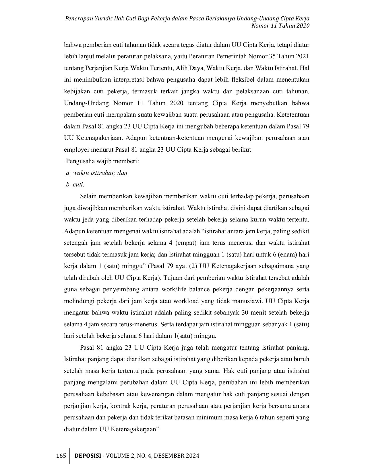 Deposisi: Jurnal Publikasi Ilmu HukumDeposisi: Jurnal Publikasi Ilmu HukumUndang-Undang Cipta Kerja Nomor 11 Tahun 2020 membawa perubahan signifikan terhadap berbagai aspek ketenagakerjaan, termasuk hak cuti bagi pekerja. Artikel ini bertujuan untuk menganalisis penerapan hak cuti secara yuridis setelah diberlakukannya undang-undang tersebut, dengan fokus pada perubahan yang terjadi dan dampaknya terhadap hubungan pekerja dan pengusaha. Meskipun hak cuti seperti cuti tahunan, cuti melahirkan, dan cuti sakit masih diakui, pengaturan rinci mengenai pelaksanaan cuti diserahkan pada peraturan pelaksana atau perjanjian kerja. Fleksibilitas ini memberi keuntungan bagi pengusaha dalam pengelolaan tenaga kerja, namun menimbulkan kekhawatiran tentang potensi pengurangan hak pekerja. Artikel ini menyimpulkan bahwa perubahan tersebut harus direspons dengan kebijakan yang adil dan transparan untuk menjaga keseimbangan antara kepentingan pengusaha dan kesejahteraan pekerja. Penelitian dalam makalah ilmiah ini menggunakan metode penelitian deskriptif analitis. Metode ini menggambarkan data dari berbagai sumber, termasuk peraturan perundang-undangan, jurnal, dan sumber lain dari internet terkait peristiwa yang terjadi di masyarakat.