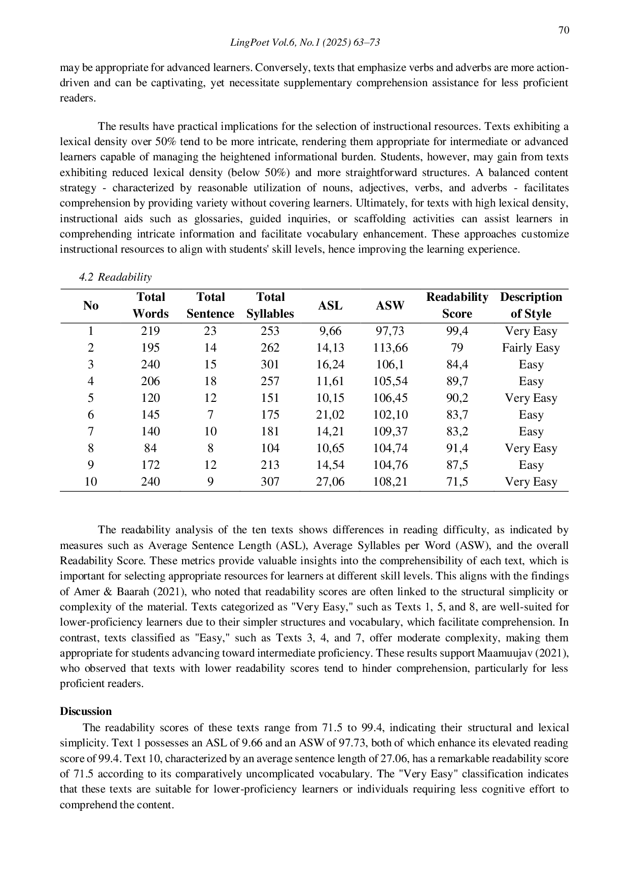 Diskusi sebelumnya menunjukkan bahwa kepadatan leksikal dan keterbacaan adalah elemen penting yang mempengaruhi kesesuaian teks untuk pembelajar bahasa, terutama dalam konteks EFL.Teks dengan kepadatan leksikal tinggi, biasanya melebihi 50%, penuh dengan kata isi, sehingga menawarkan kedalaman informasi yang lebih besar, menjadikannya cocok untuk pembelajar tingkat menengah atau lanjut yang mampu memproses materi yang rumit.Untuk pembelajar dengan tingkat kompetensi yang lebih rendah, teks dengan kepadatan leksikal lebih rendah lebih mudah diakses karena memiliki kata isi yang lebih sedikit dan beban kognitif yang lebih rendah.Teks yang diklasifikasikan sebagai Sangat Mudah atau Mudah cocok untuk pembelajar pemula dan tingkat menengah ke bawah karena bahasa dan strukturnya yang sederhana, memudahkan pemahaman.Hanya satu teks yang diklasifikasikan sebagai Cukup Mudah, menunjukkan pergeseran menuju materi yang lebih menantang untuk pembelajar yang meningkatkan keterampilan mereka.Hasil penelitian ini menyarankan bahwa sumber daya pendidikan harus dipilih dengan cermat untuk sesuai dengan tingkat kemahiran pembelajar.Dalam teks yang lebih padat, bantuan instruksional seperti glosarium atau pertanyaan panduan dapat meningkatkan pemahaman.Strategi konten komprehensif yang mencakup berbagai kata benda, kata sifat, kata kerja, dan kata keterangan meningkatkan kejelasan teks dan membantu pengembangan kosa kata, sehingga meningkatkan pengalaman belajar.