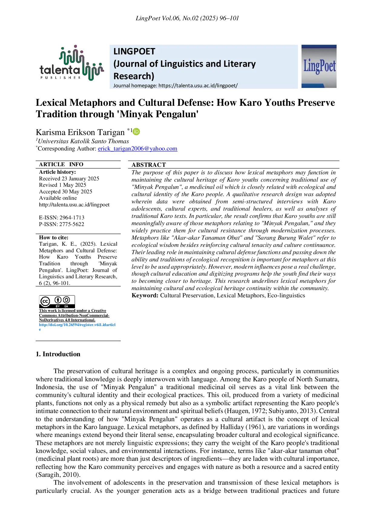LingPoet: Journal of Linguistics and Literary ResearchLingPoet: Journal of Linguistics and Literary ResearchThe purpose of this paper is to discuss how lexical metaphors may function in maintaining the cultural heritage of Karo youths concerning traditional use of Minyak Pengalun, a medicinal oil which is closely related with ecological and cultural identity of the Karo people. A qualitative research design was adopted wherein data were obtained from semi-structured interviews with Karo adolescents, cultural experts, and traditional healers, as well as analyses of traditional Karo texts. In particular, the result confirms that Karo youths are still meaningfully aware of those metaphors relating to Minyak Pengalun, and they widely practice them for cultural resistance through modernization processes. Metaphors like Akar-akar Tanaman Obat and Sarang Burung Walet refer to ecological wisdom besides reinforcing cultural tenacity and culture continuance. Their leading role in maintaining cultural defense functions and passing down the ability and traditions of ecological recognition is important for metaphors at this level to be used appropriately. However, modern influences pose a real challenge, though cultural education and digitizing programs help the youth find their ways to becoming closer to heritage. This research underlines lexical metaphors for maintaining cultural and ecological heritage continuity within the community.