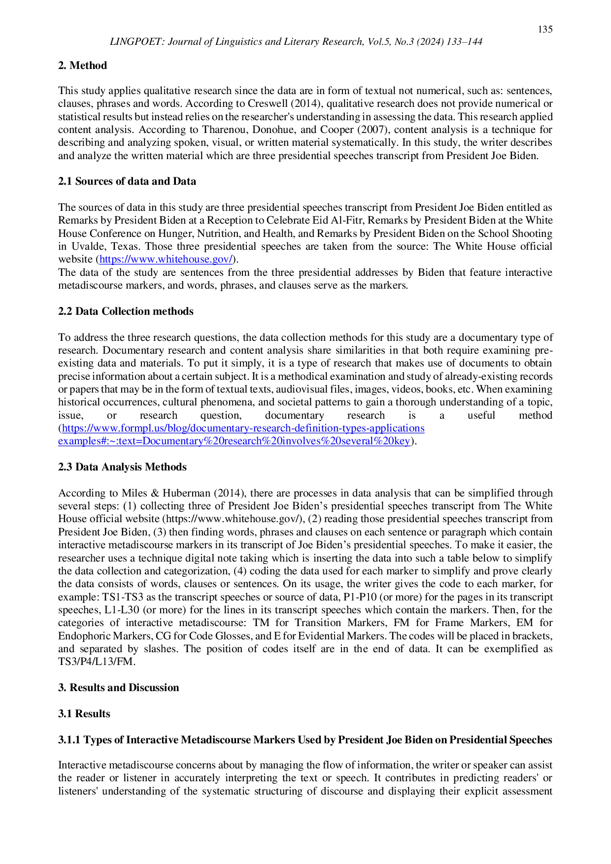 Dalam tiga pidato presiden Joe Biden yang berjudul Remarks by President Biden at a Reception to Celebrate Eid Al-Fitr, Remarks by President Biden at the White House Conference on Hunger, Nutrition, and Health, dan Remarks by President Biden On The School Shooting in Uvalde, Texas , penulis menemukan bahwa Presiden Joe Biden menggunakan semua kategori metadiscourse interaktif, termasuk.penanda transisi, penanda bingkai, penanda endoforik, bukti, dan glos kode.Data total yang ditemukan dari semua pidato presiden adalah 208 metadiscourse interaktif, yang terdiri dari.Penanda transisi adalah kategori yang paling sering digunakan oleh Presiden Joe Biden.Hal ini menunjukkan bahwa Presiden sering menambahkan, mengembangkan, dan menjelaskan setiap pernyataan yang dia sampaikan, sehingga audiens dapat dengan mudah memahami pidato atau kata-katanya.Penulis juga menemukan bahwa penanda like dapat berfungsi sebagai penanda transisi, digunakan untuk membandingkan pernyataan.Selain itu, penanda ini juga dapat digunakan untuk mengindikasikan pernyataan yang menjelaskan, yang memberikan contoh sebagai peran glos kode.