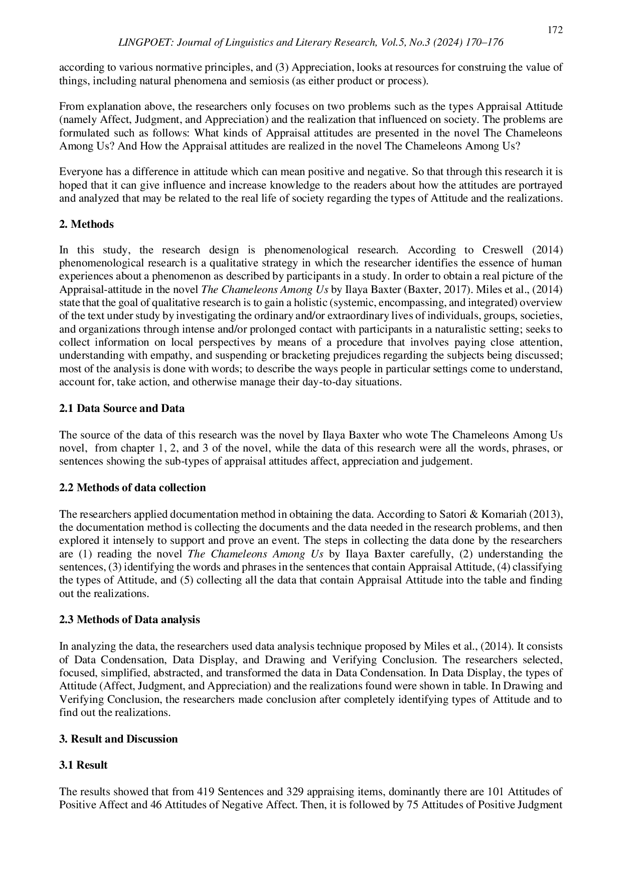 Penelitian ini menyimpulkan bahwa terdapat tiga jenis Sikap dalam novel The Chameleons Among Us karya Ilaya Baxter, yaitu Afek, Penghakiman, dan Apresiasi, serta realisasinya dalam bentuk positif dan negatif.Dominasi Sikap Afek Positif menunjukkan peran penting emosi dan perasaan dalam membangun karakter dan perilaku tokoh.Temuan ini menggarisbawahi bagaimana penulis menggunakan bahasa untuk menyampaikan emosi dan perasaan tokoh, yang didasarkan pada pengalaman pribadi penulis.Dengan demikian, penelitian ini memberikan wawasan tentang bagaimana penilaian memengaruhi hubungan dan pengalaman karakter dalam novel.