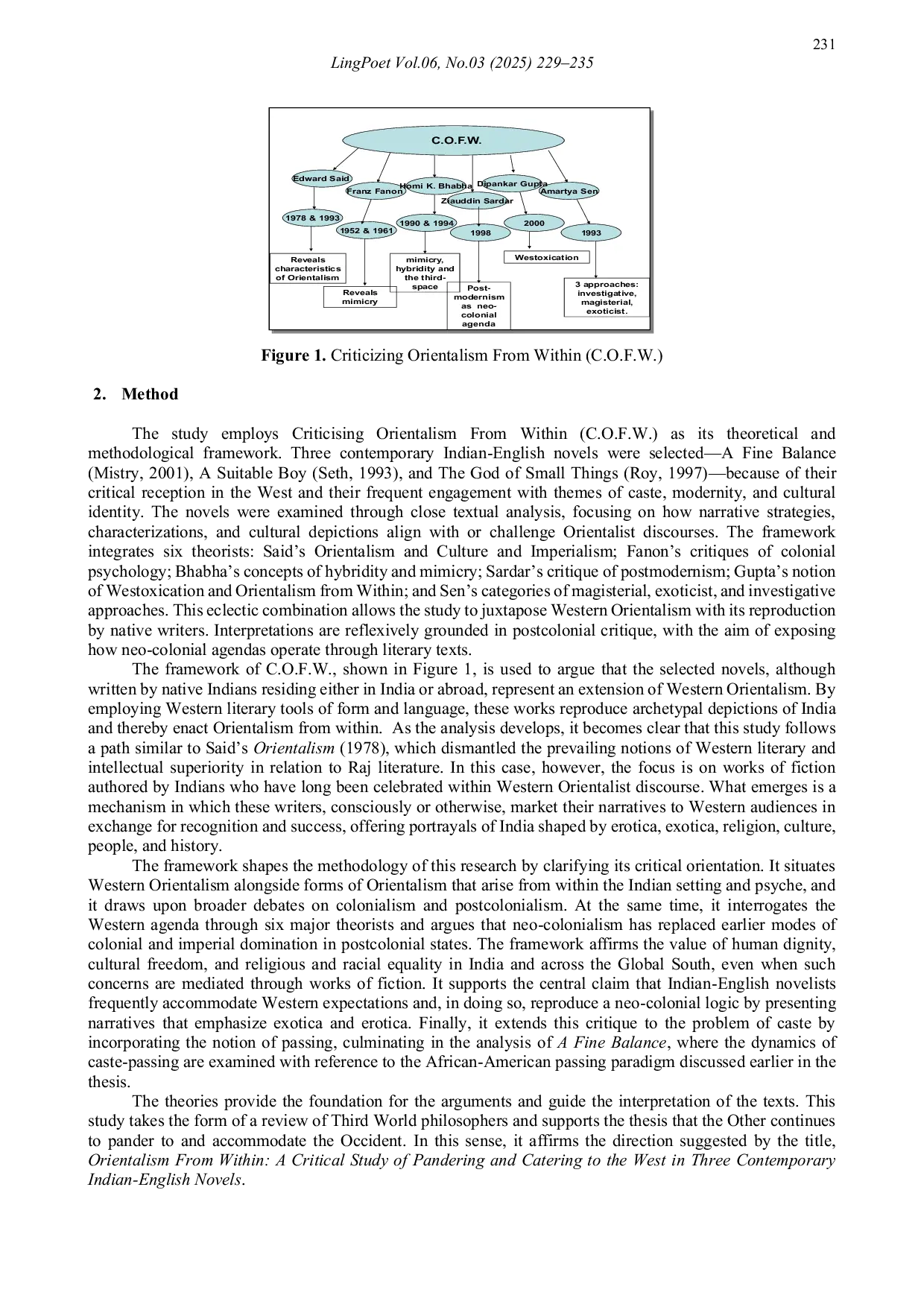 LingPoet: Journal of Linguistics and Literary ResearchLingPoet: Journal of Linguistics and Literary ResearchThis paper outlines the theoretical framework Criticising Orientalism From Within (C.O.F.W.) that foregrounds the methodology of research for the thesis Orientalism From Within: A Critical Study Of Pandering And Catering To The West In Three Contemporary Indian-English Novels (2006) and the book Orientalism from Within Arundhati Roy and Her Contemporaries (2010). The workings of imperialism and neo-colonialism in the contemporary situation is pitted against postcolonialism via Indian-English literature, and explored in the chapter titled Criticising Orientalism From Within specifically and the study generally. This chapter is an eclectic fusion of six modern theorists. The slant or methodology used is criticism and analysis of the three novels vis-à-vis an eclectic or diverse theoretical framework. However, this paper concentrates on Dipankar Guptas book India is for Sale and his term Orientalism from Within that this research has borrowed, adapted and adopted as a title to the theoretical framework, the thesis, and the book mentioned above.