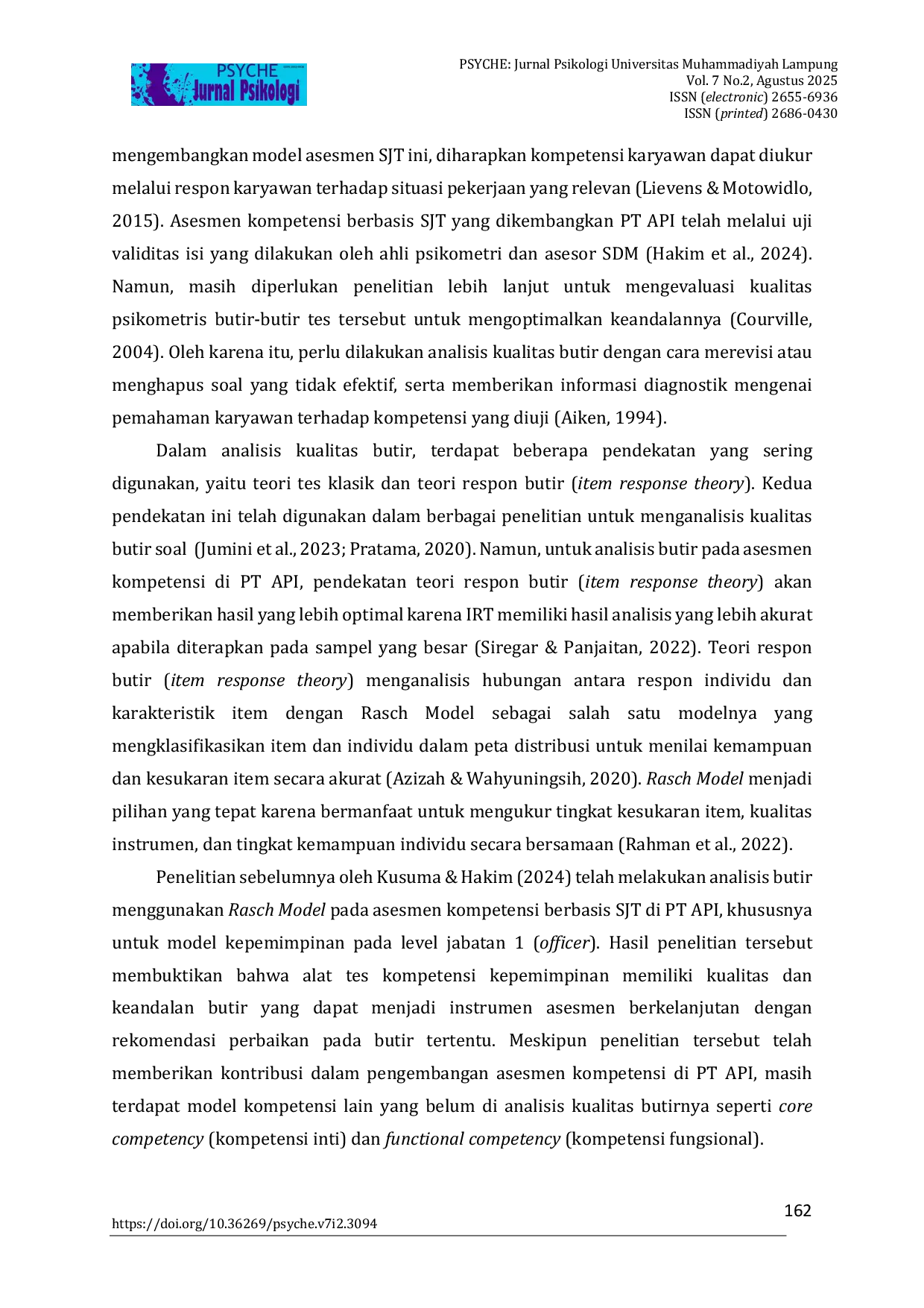 Psyche: Jurnal PsikologiPsyche: Jurnal PsikologiAsesmen kompetensi dalam manajemen sumber daya manusia sangat penting untuk memetakan kebutuhan pengembangan pegawai. PT Angkasa Pura Indonesia, salah satu perusahaan sektor transportasi di Indonesia, mengembangkan asesmen kompetensi dalam bentuk tes menggunakan metode Situational Judgment Test (SJT). Penelitian ini bertujuan untuk melakukan analisis kualitas butir SJT kompetensi inti dengan model Rasch berdasarkan sampel karyawan PT Angkasa Pura Indonesia. Teknik purposive sampling digunakan dengan kriteria pemilihan sampel yaitu karyawan PT Angkasa Pura Indonesia dengan kelompok jabatan level 1 (officer) sebanyak 3.989 karyawan. Analisis kualitas butir dilakukan dengan model Rasch pada 27 butir soal yang mengukur tiga kompetensi inti, yaitu Customer Focus (CFO), Driving Innovation (DIN), dan Building Strategic Partnership (BSP). Hasil analisis Rasch menunjukkan keseluruhan butir fit dengan nilai infit dan outfit dalam rentang (0,5 - 1,5), sedangkan pada measure seluruh butir berada dalam rentang logit sedang (-2,0 - 2,0). Wright Map menunjukkan bahwa tiga kompetensi inti memotret kemampuan pada tingkatan rerata. Namun, butir soal pada kompetensi CFO dan DIN tidak memotret abilitas rendah maupun tinggi, sedangkan pada BSP butir soal tidak memotret abilitas rendah. Penelitian ini menyimpulkan bahwa instrumen SJT ini memiliki kualitas dan keandalan yang baik sebagai alat asesmen kompetensi inti di PT Angkasa Pura Indonesia.