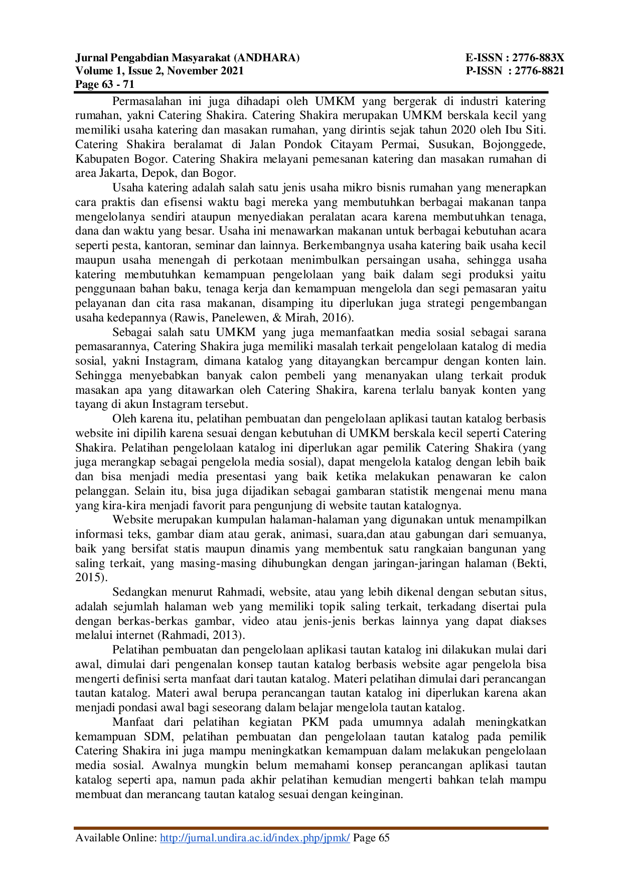 AndharaAndharaWebsite merupakan salah satu media promosi yang dapat digunakan sebagai presentasi yang tepat ke calon pelanggan. Catering Shakira adalah sebuah UMKM yang bergerak di bidang katering rumahan yang melakukan promosi dan pemasaran produk secara online melalui media sosial. Saat ini, Catering Shakira menampilkan produk-produk mereka, layaknya sebuah katalog, pada akun media sosial yang mereka buat. Namun, fungsi media sosial sebagai katalog menjadi tidak efektif karena bercampur dengan konten-konten baru yang diunggah di media sosial Catering Shakira untuk melakukan pembaruan. Sehingga perlu ada media khusus yang hanya berisi katalog dari kumpulan produk. Dengan jumlah produk yang beragam, sehingga diperlukan adanya pengelolaan katalog pada sebuah aplikasi tautan berbasis website. Tujuan PKM ini adalah memberikan pelatihan pembuatan dan pengelolaan tautan katalog agar produk-produk yang dimiliki dapat ditayangkan secara rapi layaknya katalog produk konvensional. Harapannya melalui PKM ini, dapat meningkatkan kompetensi pemilik Catering Shakira, yang juga berfungsi sebagai pengelola akun media sosial. Sehingga nantinya pemilik Catering Shakira bisa memiliki website yang dapat dijadikan sebagai katalog produk untuk dipromosikan kepada calon pelanggan.