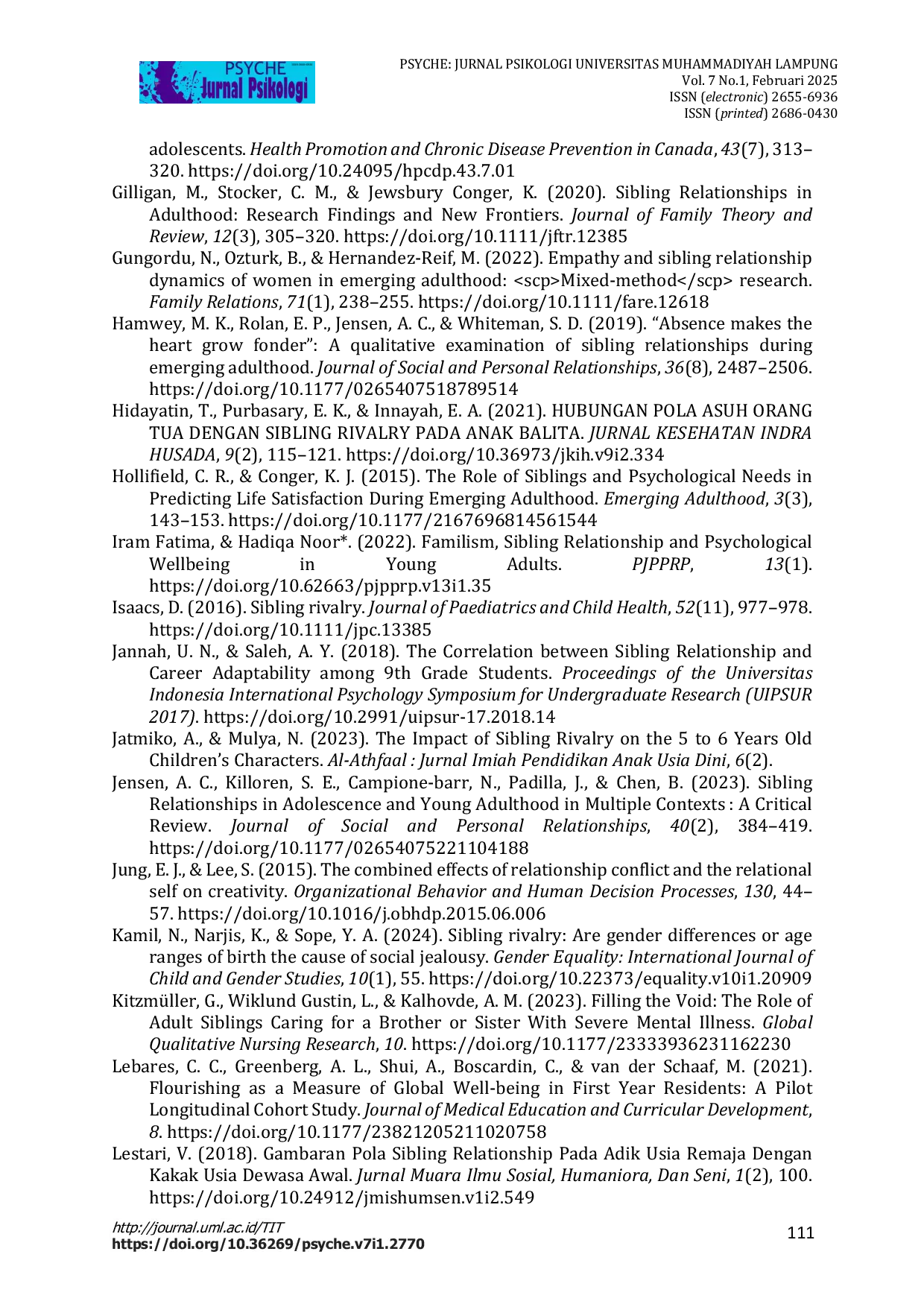 Psyche: Jurnal PsikologiPsyche: Jurnal PsikologiPenelitian ini bertujuan untuk melihat hubungan antara kualitas hubungan saudara dengan flourishing di masa dewasa awal. Beberapa variabel seperti, tinggal terpisah atau bersama, intensitas kehangatan dan konflik yang dialami antar saudara dapat memberikan dampak bagi pertumbuhan flourishing seseorang. Partisipan yang terlibat dalam penelitian ini berjumlah 395 orang, berusia 18-25 tahun, berjenis kelamin laki-laki dan perempuan, memiliki setidaknya 1 saudara serta sudah tinggal terpisah selama minimal 1 tahun. Pengukuran dalam penelitian ini dilakukan menggunakan 2 skala yaitu Adult Sibling Relationship Questionnaire (ASRQ) dan PERMA Profiler. Hasil uji statistik menunjukkan bahwa ada hubungan signifikan antara flourishing dengan aspek-aspek kualitas hubungan saudara, warmth (r=0.229; p=0.000), conflict (r=0.128; p=0.001), namun tidak berkorelasi dengan aspek rivalry (r=-0.077; p=0.129). Hal ini menegaskan bahwa kualitas hubungan persaudaraan pada masa dewasa awal berkontribusi dalam flourishing melalui konflik dan kehangatan yang dirasakan, serta pencapaian permusuhan yang semakin berkurang. Konflik tidak dapat dipandang sebagai sesuatu yang negatif namun berkontribusi terhadap peningkatan kehangatan dan menunjang kualitas hubungan saudara.