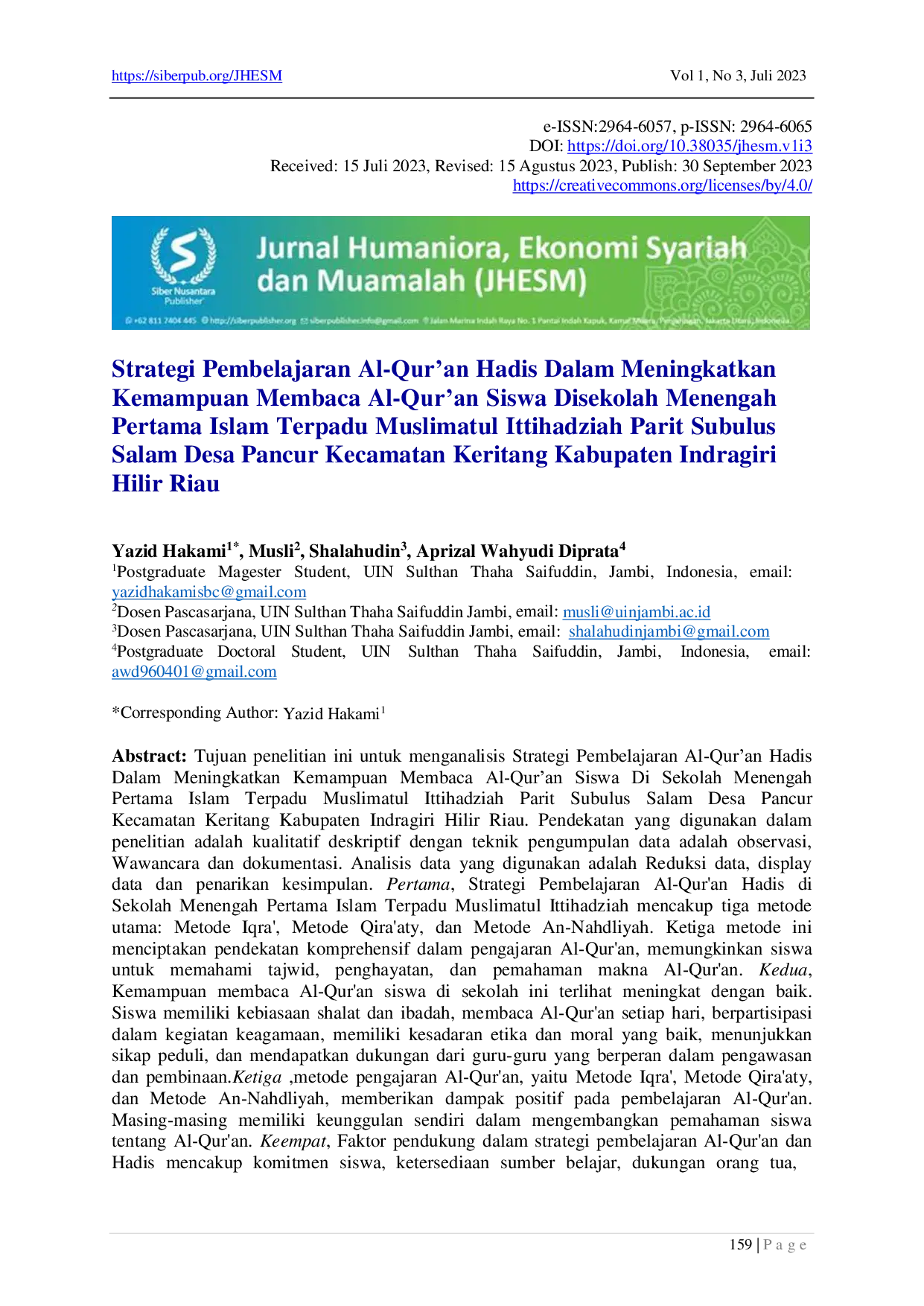 Jurnal Humaniora, Ekonomi Syariah dan MuamalahJurnal Humaniora, Ekonomi Syariah dan MuamalahTujuan penelitian ini untuk menganalisis strategi pembelajaran Al-Quran Hadis dalam meningkatkan kemampuan membaca Al-Quran siswa di Sekolah Menengah Pertama Islam Terpadu Muslimatul Ittihadziah Parit Subulus Salam Desa Pancur Kecamatan Keritang Kabupaten Indragiri Hilir Riau. Pendekatan yang digunakan dalam penelitian adalah kualitatif deskriptif dengan teknik pengumpulan data adalah observasi, wawancara, dan dokumentasi. Analisis data yang digunakan adalah reduksi data, display data, dan penarikan kesimpulan. Pertama, strategi pembelajaran Al-Quran Hadis di sekolah tersebut mencakup tiga metode utama: metode Iqra, metode Qiraaty, dan metode An-Nahdliyah. Ketiga metode ini menciptakan pendekatan komprehensif dalam pengajaran Al-Quran, memungkinkan siswa memahami tajwid, penghayatan, dan pemahaman makna Al-Quran. Kedua, kemampuan membaca Al-Quran siswa di sekolah ini terlihat meningkat dengan baik. Siswa memiliki kebiasaan shalat dan ibadah, membaca Al-Quran setiap hari, berpartisipasi dalam kegiatan keagamaan, memiliki kesadaran etika dan moral yang baik, menunjukkan sikap peduli, serta mendapatkan dukungan dari guru-guru yang berperan dalam pengawasan dan pembinaan. Ketiga, metode pengajaran Al-Quran, yaitu metode Iqra, metode Qiraaty, dan metode An-Nahdliyah, memberikan dampak positif pada pembelajaran Al-Quran. Masing-masing memiliki keunggulan sendiri dalam mengembangkan pemahaman siswa tentang Al-Quran. Keempat, faktor pendukung dalam strategi pembelajaran Al-Quran dan Hadis mencakup komitmen siswa, ketersediaan sumber belajar, dukungan orang tua, kualitas pengajaran, dan lingkungan sekolah yang mendukung. Sementara faktor penghambat meliputi kurangnya motivasi siswa, keterbatasan sumber daya, teknologi yang terbatas, gangguan lingkungan, dan kesibukan lainnya. Dengan memanfaatkan faktor pendukung dan mengatasi faktor penghambat, sekolah dapat terus meningkatkan kemampuan membaca Al-Quran siswa.