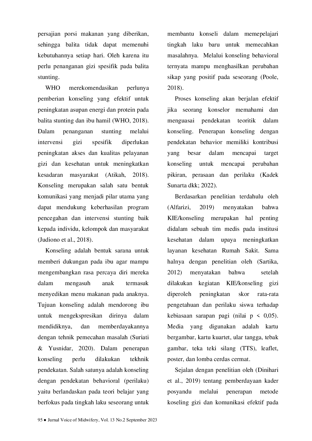 Voice of MidwiferyVoice of MidwiferyStunting merupakan kondisi gagal tumbuh pada anak balita akibat kekurangan gizi kronis terutama pada 1.000 Hari Pertama Kehidupan (HPK). Asupan gizi merupakan subtansi makanan yang dibutuhkan tubuh untuk hidup sehat, seperti karbohidrat, protein, lemak, vitamin dan mineral. Dalam penanganan stunting melalui intervensi gizi spesifik diperlukan peningkatan akses dan kualitas pelayanan gizi dan kesehatan untuk meningkatkan kesadaran masyarakat. Salah satu permasalahan pembangunan kesehatan yang sampai saat ini masih merupakan prioritas permasalahan disuatu negara, baik di tingkat internasional, nasional dan lokal, karena berdampak pada generasi Sumber Daya Manusia (SDM) yang kelak dihasilkan, termasuk di kota palopo. Jenis penelitian pre-eksperimen dengan pendekatan one group pretest-postest. Model intervensi yang diberikan adalah konseling dengan pendekatan behavior. Teknik penarikan sampel purposive sampling. Analisis data menggunakan uji wilcoxon. Berdasarkan hasil uji statistik menggunakan uji wilcoxon diperoleh nilai ρ = 0,000 < nilai α = 0,05. Hal ini berarti konseling melalui pendekatan behaviour memiliki implikasi terhadap peningkatan asupan makronutrien pada balita stunting. Ada Penerapan konseling behavior (perilaku) memiliki implikasi yang positif terhadap peningkatan asupan gizi makro (energi, karbohidrat, protein, lemak) pada balita stunting di Kota Palopo (ρ < 0,05).