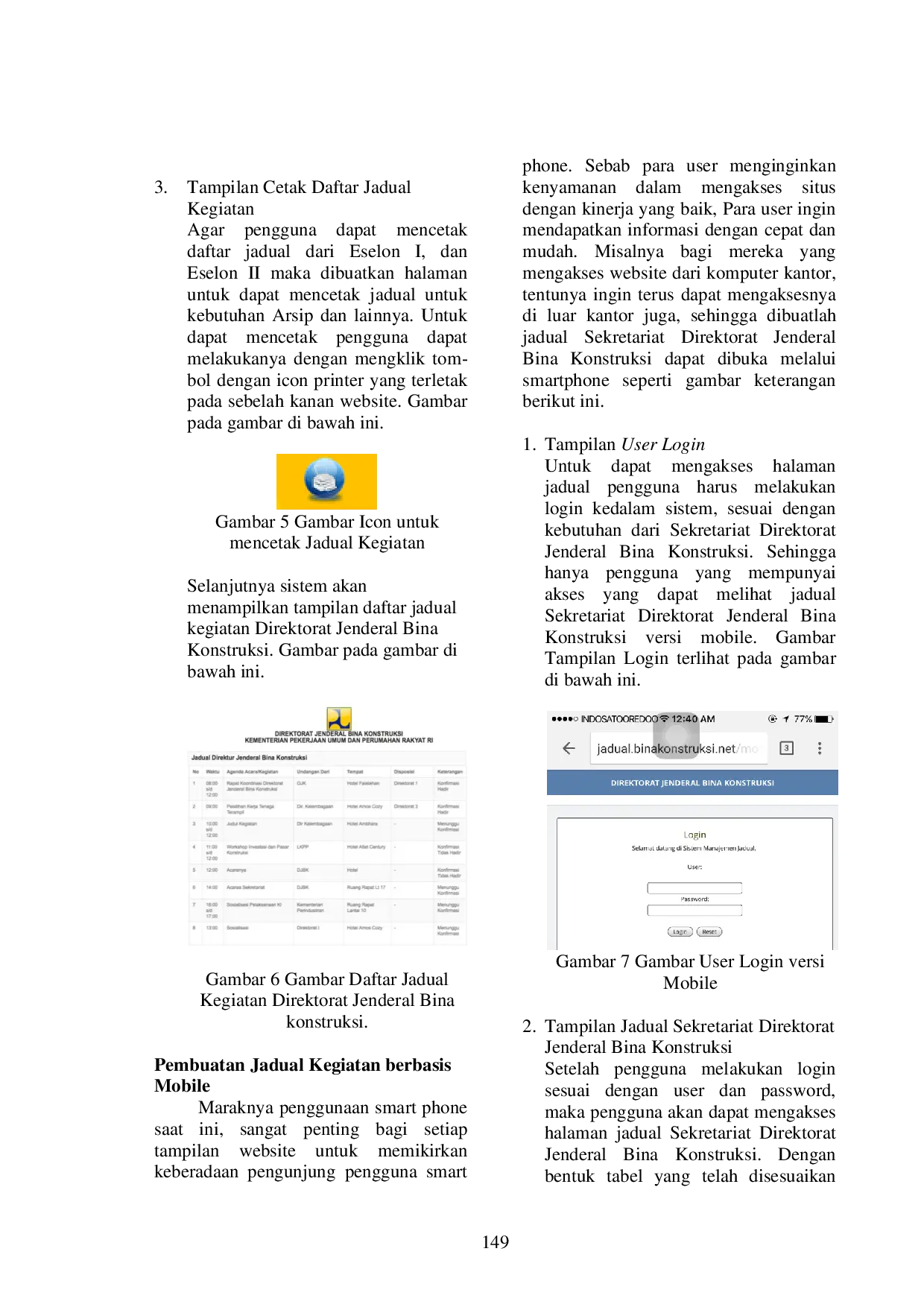 JSI (Jurnal sistem Informasi) Universitas SuryadarmaJSI (Jurnal sistem Informasi) Universitas SuryadarmaAplikasi ini merupakan sebuah website yang menyediakan jadwal kegiatan Direktorat Jenderal Bina Konstruksi. Aplikasi ini dirancang untuk mengingatkan Kepala Bagian tentang acara yang berlangsung dalam seminggu terakhir, dengan mengutamakan teknologi dan fungsi. Website ini diharapkan dapat menampilkan jadwal kegiatan dalam format yang sesuai dengan berbagai media, seperti videotron, televisi, dan smartphone, sehingga dapat diakses di luar kantor. Tujuannya adalah membantu staf dan kepala bagian dalam mengatur waktu dan pekerjaan mereka. Informasi kegiatan pada Direktorat Jenderal Bina Konstruksi harus dikelola dengan baik, benar, dan estetis, serta ramah pengguna. Penelitian ini menggunakan metode prototipe dan menghasilkan website yang dapat menampilkan jadwal kegiatan Direktorat Jenderal Bina Konstruksi yang dapat diakses dari mana saja melalui smartphone dan ditampilkan pada videotron atau televisi.