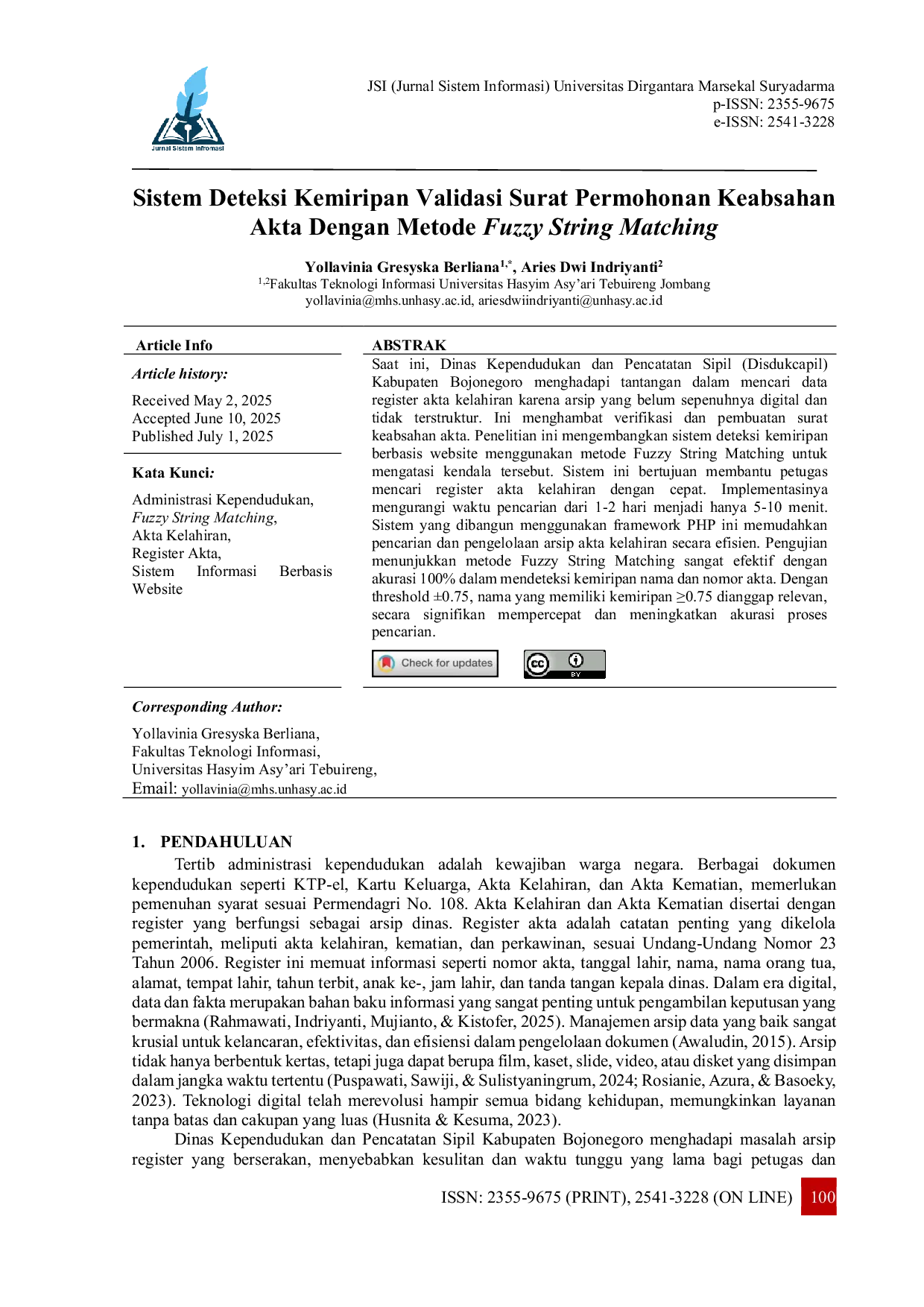 JSI (Jurnal sistem Informasi) Universitas SuryadarmaJSI (Jurnal sistem Informasi) Universitas SuryadarmaSaat ini, Dinas Kependudukan dan Pencatatan Sipil (Disdukcapil) Kabupaten Bojonegoro menghadapi tantangan dalam mencari data register akta kelahiran karena arsip yang belum sepenuhnya digital dan tidak terstruktur. Ini menghambat verifikasi dan pembuatan surat keabsahan akta. Penelitian ini mengembangkan sistem deteksi kemiripan berbasis website menggunakan metode Fuzzy String Matching untuk mengatasi kendala tersebut. Sistem ini bertujuan membantu petugas mencari register akta kelahiran dengan cepat. Implementasinya mengurangi waktu pencarian dari 1-2 hari menjadi hanya 5-10 menit. Sistem yang dibangun menggunakan framework PHP ini memudahkan pencarian dan pengelolaan arsip akta kelahiran secara efisien. Pengujian menunjukkan metode Fuzzy String Matching sangat efektif dengan akurasi 100% dalam mendeteksi kemiripan nama dan nomor akta. Dengan threshold ±0.75, nama yang memiliki kemiripan ≥0.75 dianggap relevan, secara signifikan mempercepat dan meningkatkan akurasi proses pencarian.