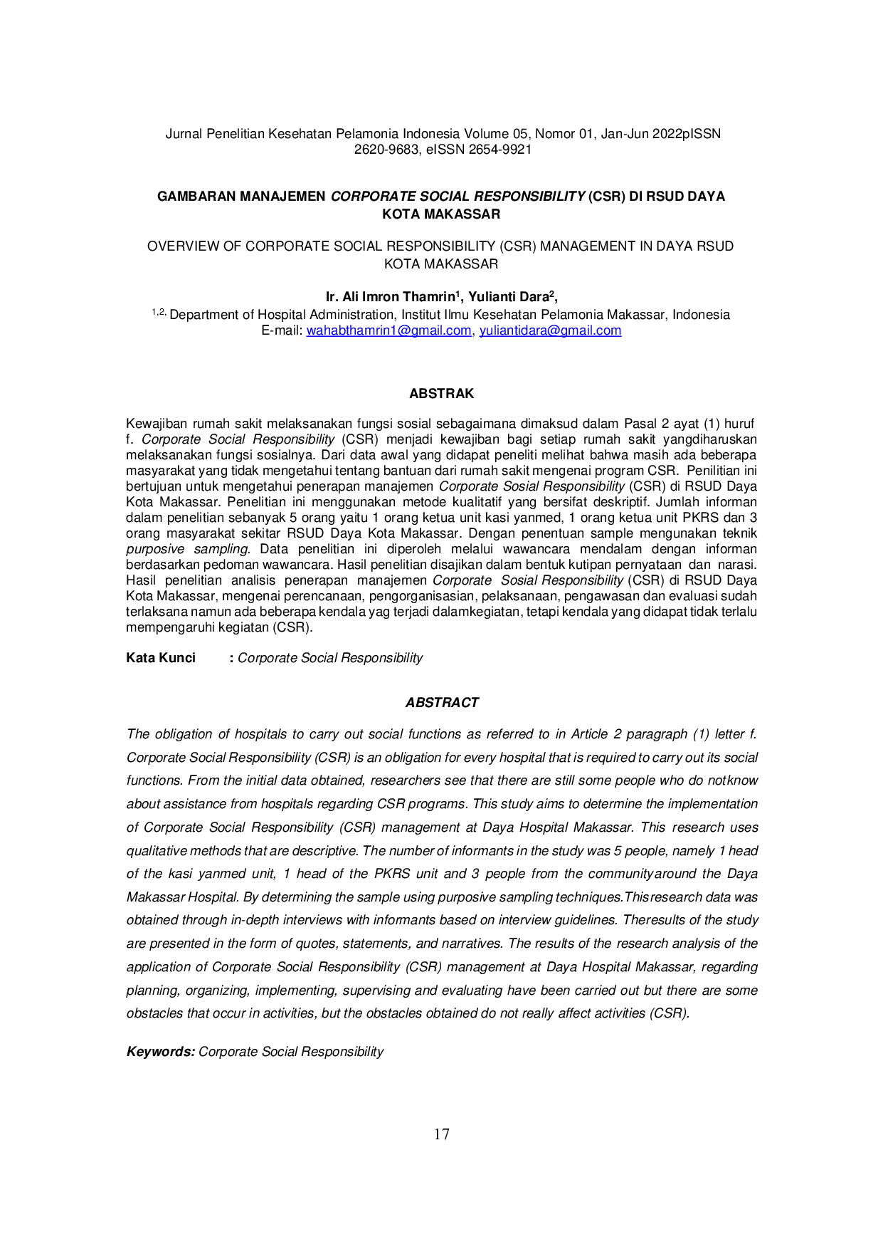 Jurnal Penelitian Kesehatan Pelamonia IndonesiaJurnal Penelitian Kesehatan Pelamonia IndonesiaKewajiban rumah sakit melaksanakan fungsi sosial sebagaimana dimaksud dalam Pasal 2 ayat (1) huruf f. Corporate Social Responsibility (CSR) menjadi kewajiban bagi setiap rumah sakit yang diharuskan melaksanakan fungsi sosialnya. Dari data awal yang didapat peneliti melihat bahwa masih ada beberapa masyarakat yang tidak mengetahui tentang bantuan dari rumah sakit mengenai program CSR. Penelitian ini bertujuan untuk mengetahui penerapan manajemen Corporate Sosial Responsibility (CSR) di RSUD Daya Kota Makassar. Penelitian ini menggunakan metode kualitatif yang bersifat deskriptif. Jumlah informan dalam penelitian sebanyak 5 orang yaitu 1 orang ketua unit kasi yanmed, 1 orang ketua unit PKRS dan 3 orang masyarakat sekitar RSUD Daya Kota Makassar. Dengan penentuan sampel menggunakan teknik purposive sampling. Data penelitian ini diperoleh melalui wawancara mendalam dengan informan berdasarkan pedoman wawancara. Hasil penelitian disajikan dalam bentuk kutipan pernyataan dan narasi. Hasil penelitian analisis penerapan manajemen Corporate Sosial Responsibility (CSR) di RSUD Daya Kota Makassar, mengenai perencanaan, pengorganisasian, pelaksanaan, pengawasan dan evaluasi sudah terlaksana namun ada beberapa kendala yang terjadi dalam kegiatan, tetapi kendala yang didapat tidak terlalu mempengaruhi kegiatan (CSR).