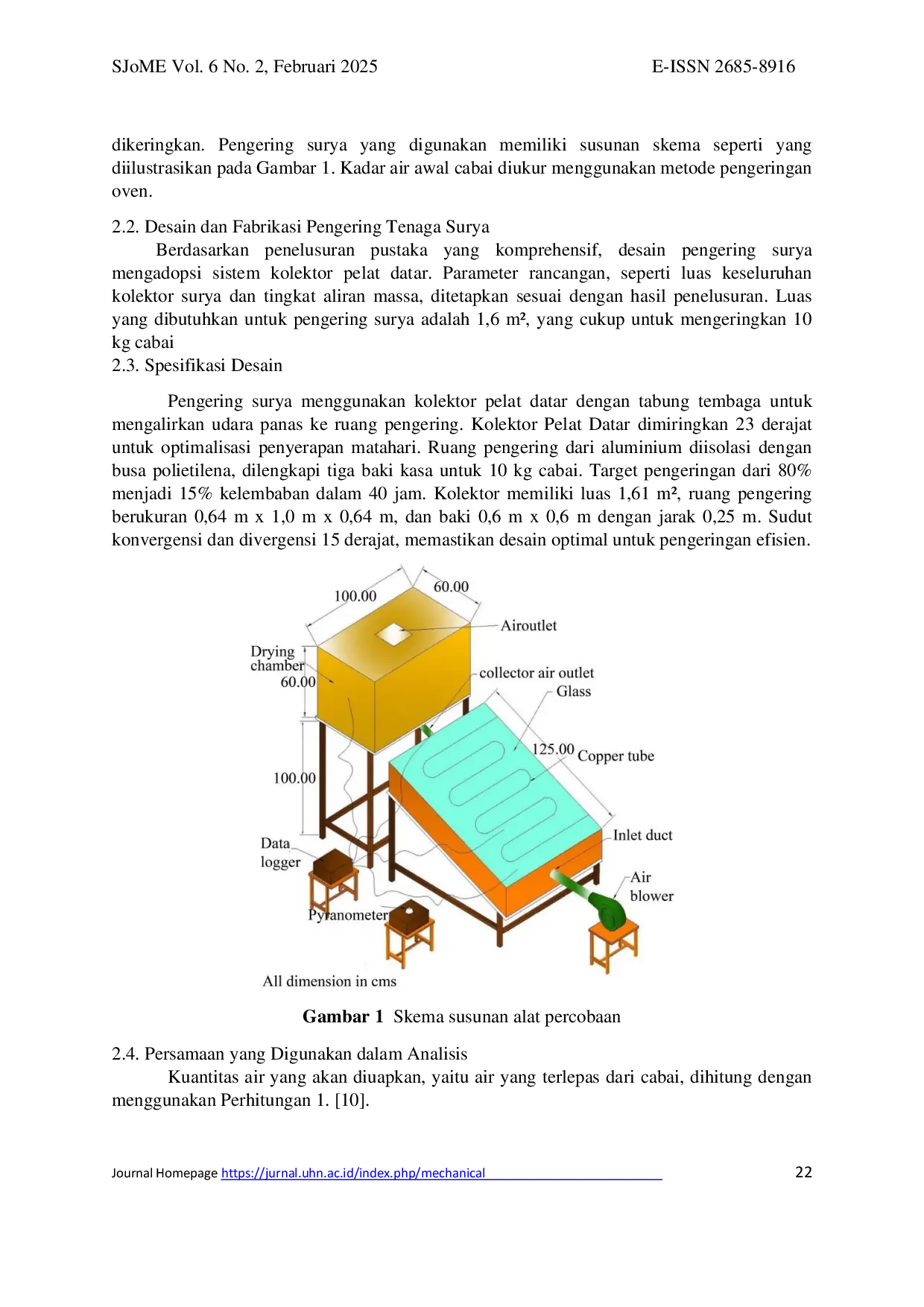 SPROCKET JOURNAL OF MECHANICAL ENGINEERINGSPROCKET JOURNAL OF MECHANICAL ENGINEERINGStudi ini menyelidiki efektivitas mesin pengering tenaga surya yang memanfaatkan sistem Kolektor Pelat Datar untuk pengeringan cabai. Studi ini bertujuan untuk menilai efisiensi pengering dalam berbagai kondisi lingkungan. Kolektor berukuran 2 meter x 0,8 meter digunakan untuk menangkap energi matahari, yang kemudian dialirkan ke ruang pengeringan berisi tiga rak baja tahan karat. Eksperimen menunjukkan bahwa pengering mampu menghasilkan suhu hingga 80°C. Pengukuran radiasi matahari dan kelembaban menunjukkan hubungan erat antara intensitas matahari siang hari dan kondisi pengeringan yang ideal. Laju pengeringan mengikuti pola tipikal pengeringan tenaga surya, dengan fase awal yang cepat diikuti fase yang lebih lambat. Efisiensi pengering mencapai puncaknya pada siang hari. Hasil ini memvalidasi desain pengering sebagai solusi potensial untuk pengeringan hasil pertanian yang efisien dan berkelanjutan. Penelitian lebih lanjut akan difokuskan pada optimasi desain dan material.