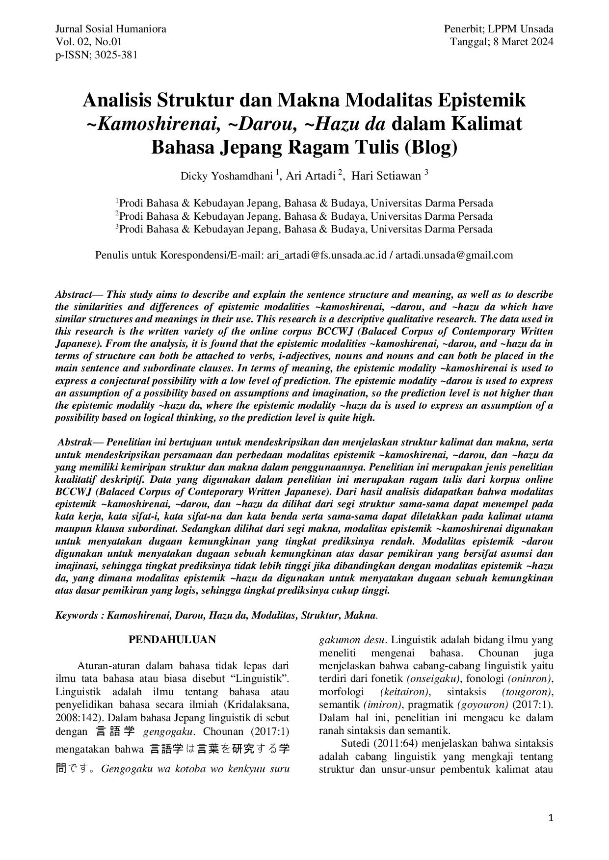 Jurnal Sosial HumanioraJurnal Sosial HumanioraPenelitian ini bertujuan untuk mendeskripsikan dan menjelaskan struktur kalimat dan makna, serta untuk mendeskripsikan persamaan dan perbedaan modalitas epistemik ~kamoshirenai, ~darou, dan ~hazu da yang memiliki kemiripan struktur dan makna dalam penggunaannya. Penelitian ini merupakan jenis penelitian kualitatif deskriptif. Data yang digunakan dalam penelitian ini merupakan ragam tulis dari korpus online BCCWJ (Balaced Corpus of Conteporary Written Japanese). Dari hasil analisis didapatkan bahwa modalitas epistemik ~kamoshirenai, ~darou, dan ~hazu da dilihat dari segi struktur sama-sama dapat menempel pada kata kerja, kata sifat-i, kata sifat-na dan kata benda serta sama-sama dapat diletakkan pada kalimat utama maupun klausa subordinat. Sedangkan dilihat dari segi makna, modalitas epistemik ~kamoshirenai digunakan untuk menyatakan dugaan kemungkinan yang tingkat prediksinya rendah. Modalitas epistemik ~darou digunakan untuk menyatakan dugaan sebuah kemungkinan atas dasar pemikiran yang bersifat asumsi dan imajinasi, sehingga tingkat prediksinya tidak lebih tinggi jika dibandingkan dengan modalitas epistemik ~hazu da, yang dimana modalitas epistemik ~hazu da digunakan untuk menyatakan dugaan sebuah kemungkinan atas dasar pemikiran yang logis, sehingga tingkat prediksinya cukup tinggi.