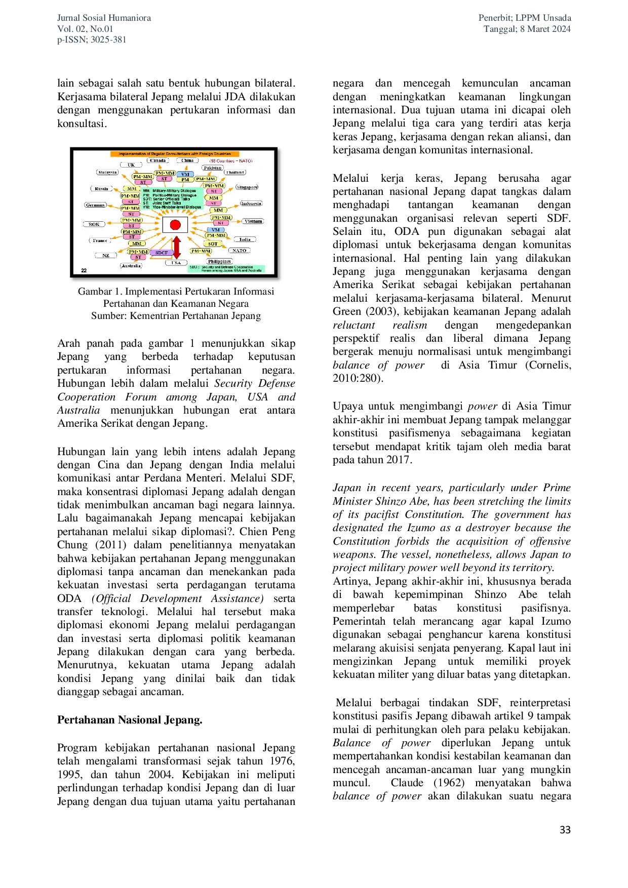 Jurnal Sosial HumanioraJurnal Sosial HumanioraKonstitusi Jepang adalah pasifisme sejak tahun 1950, yaitu konsentrasi diplomasi militer yang mengalami perubahan akibat kekalahan Jepang terhadap sekutu, terutama Amerika Serikat. Pasifisme secara khusus diperkenalkan oleh Supreme Commander of Alliance Power (SCAP) sebagai upaya mengubah citra negara dan wajah feodal Jepang. Dalam perkembangannya, Jepang membentuk Japan Defense Agency (JDA) sebagai lembaga pertahanan keamanan. Amerika Serikat dan Jepang memperkuat hubungan untuk menjaga keamanan negara baik dalam kepentingan domestik maupun bilateral. Tulisan ini menjelaskan hubungan konstitusi pasifisme Jepang menggunakan Japan Maritime Self Defence Force (JMSDF) sebagai alat diplomasi maritim dengan Amerika Serikat.