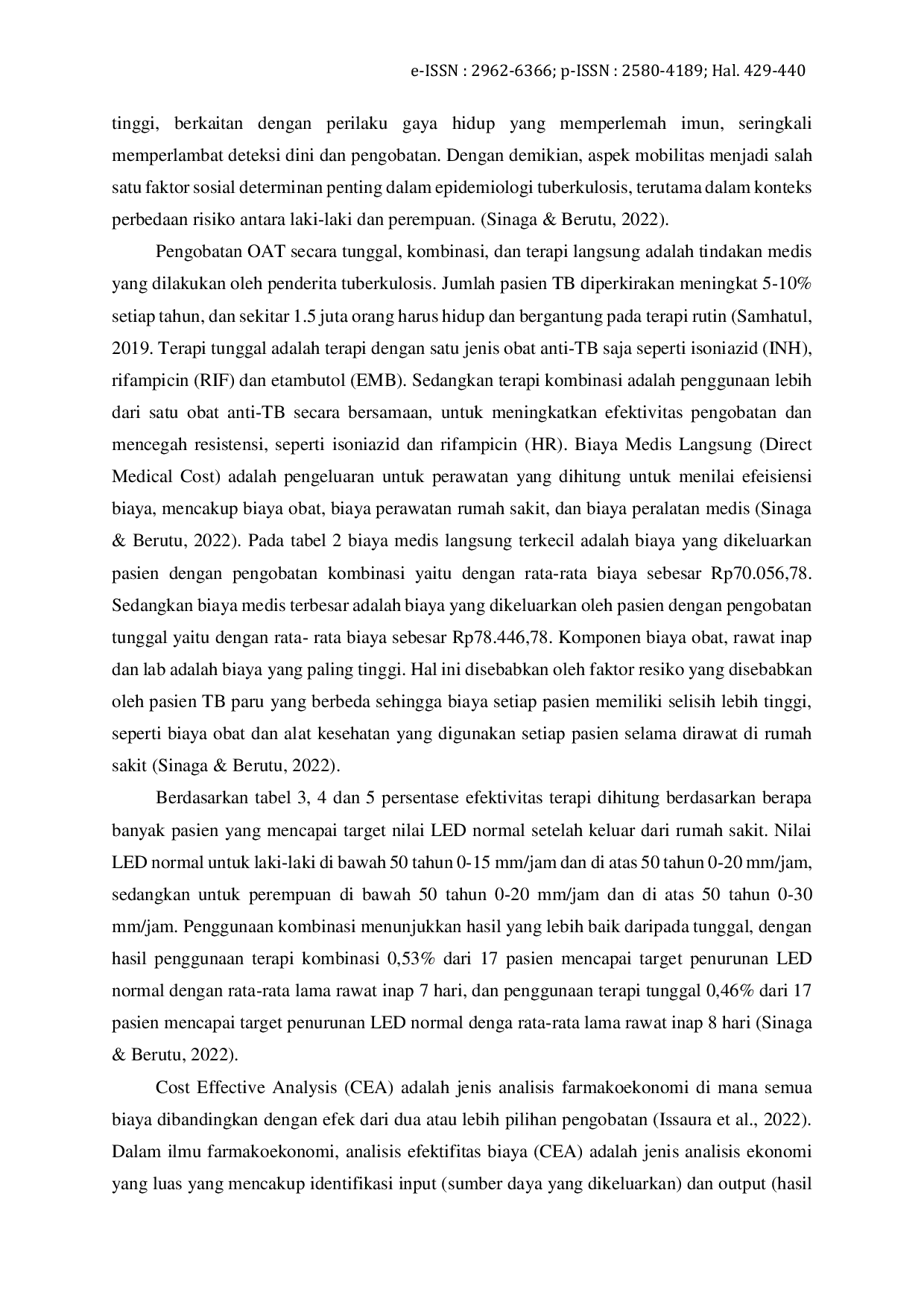 Berdasarkan latar belakang, metode, hasil, dan keterbatasan penelitian ini, berikut adalah saran penelitian lanjutan: Pertama, perlu dilakukan penelitian lebih lanjut untuk mengeksplorasi faktor-faktor yang mempengaruhi efektivitas dan efisiensi biaya pengobatan tuberkulosis, seperti faktor demografis, kondisi medis pasien, dan faktor-faktor sosial-ekonomi. Kedua, penelitian dapat difokuskan pada analisis biaya-manfaat yang lebih komprehensif, termasuk analisis biaya tak langsung dan dampak sosial-ekonomi pengobatan tuberkulosis. Ketiga, penelitian dapat dilakukan untuk mengevaluasi efektivitas dan biaya pengobatan kombinasi yang berbeda, termasuk kombinasi obat yang lebih baru dan inovatif, untuk meningkatkan efektivitas pengobatan dan mengurangi risiko resistensi obat.