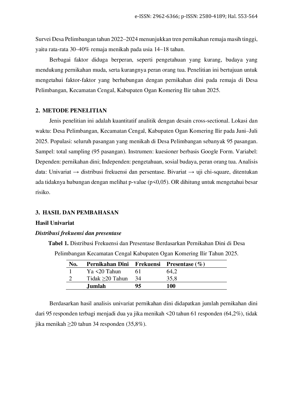 Jurnal Kesehatan AmanahJurnal Kesehatan AmanahPernikahan dini di Indonesia, termasuk di Desa Pelimbangan, Kecamatan Cengal, Kabupaten Ogan Komering Ilir, menjadi masalah kesehatan reproduksi yang signifikan. Fenomena ini menyebabkan dampak negatif seperti putusnya pendidikan, gangguan kesehatan reproduksi, tingginya angka perceraian, dan kemiskinan antargenerasi. Penelitian ini bertujuan untuk mengidentifikasi faktor-faktor yang mempengaruhi pernikahan dini pada remaja di Desa Pelimbangan pada tahun 2025. Faktor-faktor yang diteliti meliputi pengetahuan, faktor sosial budaya, dan peran orang tua dalam pencegahan. Penelitian ini menggunakan pendekatan kuantitatif dengan desain cross-sectional, dengan populasi 95 pasangan yang menikah pada tahun 2022–2024. Teknik pengumpulan data menggunakan kuesioner yang diuji validitas dan reliabilitasnya. Hasil penelitian menunjukkan bahwa pengetahuan rendah berhubungan signifikan dengan pernikahan dini (p = 0,026; OR = 3,275), remaja dengan pengetahuan rendah memiliki peluang 3,275 kali lebih besar untuk menikah dini. Faktor sosial budaya tidak berhubungan signifikan (p = 0,053; OR = 2,865), sedangkan peran orang tua berhubungan signifikan (p = 0,018; OR = 3,358). Kesimpulan penelitian ini menyarankan peningkatan edukasi kesehatan reproduksi dan penguatan peran orang tua untuk mencegah pernikahan dini secara efektif dan berkelanjutan.