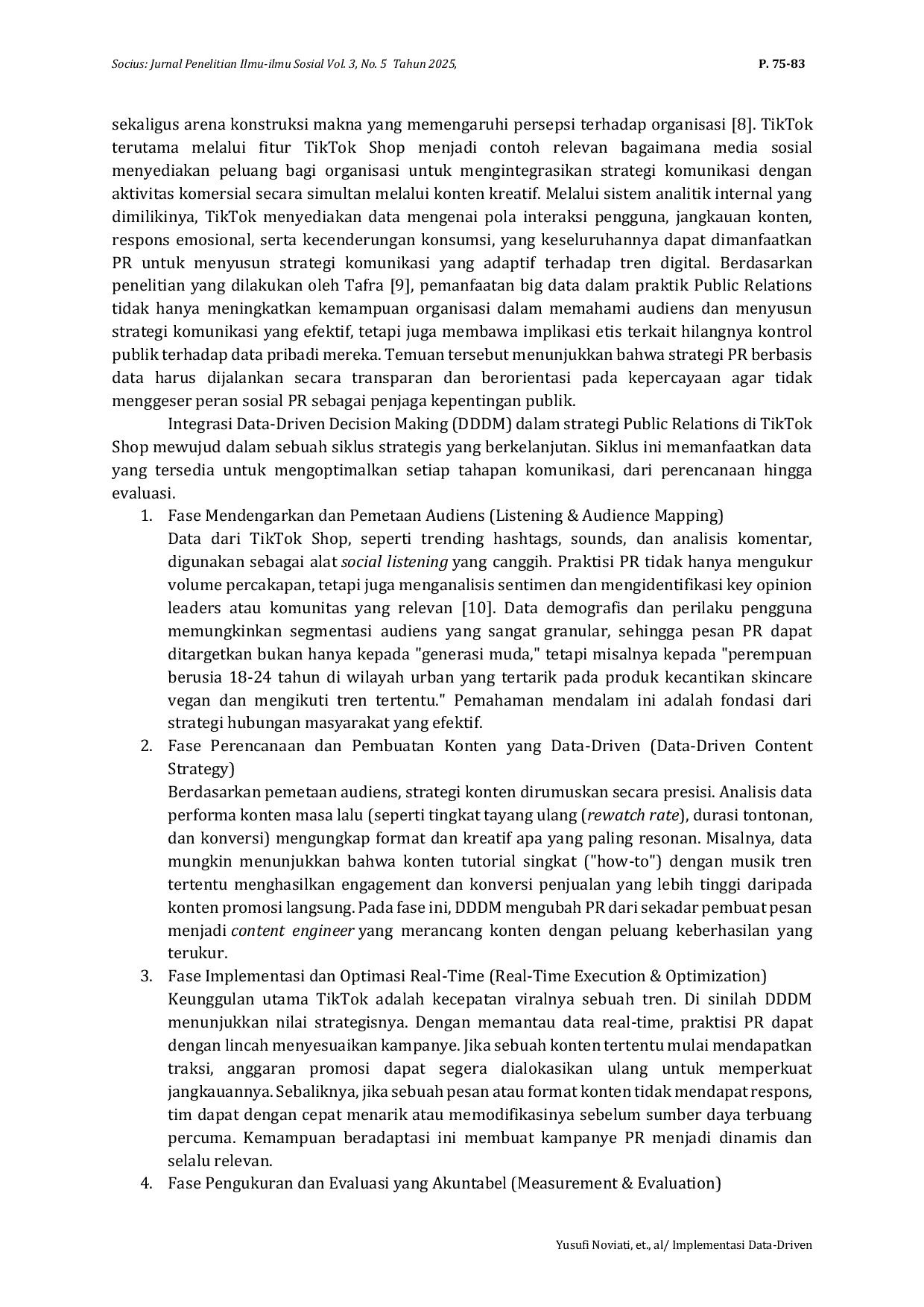 Socius: Jurnal Penelitian Ilmu-Ilmu SosialSocius: Jurnal Penelitian Ilmu-Ilmu SosialImplementasi Data-Driven Decision Making (DDDM) dalam strategi Public Relations pada kampanye TikTok Shop mengubah pendekatan komunikasi dari intuisi menjadi strategi berbasis bukti. Penelitian ini menyoroti empat tahapan integratif: pemetaan audiens melalui data demografis dan perilaku, perumusan konten berdasarkan insight historis, optimalisasi real-time berdasarkan respons audiens, serta evaluasi terukur yang menghubungkan kinerja komunikasi dengan tujuan bisnis. Pendekatan ini memungkinkan komunikasi yang lebih tepat sasaran, personal, dan efektif, sekaligus memperkuat fungsi strategis PR dalam ekosistem e-commerce TikTok Shop yang kompetitif.
