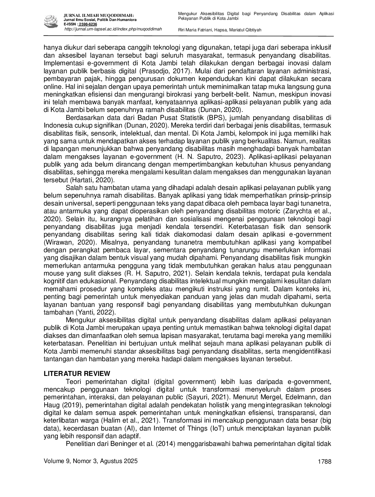 Jurnal Ilmiah Muqoddimah : Jurnal Ilmu Sosial, Politik, dan HumanioraJurnal Ilmiah Muqoddimah : Jurnal Ilmu Sosial, Politik, dan HumanioraPenelitian ini bertujuan untuk mengidentifikasi hambatan aksesibilitas digital yang dihadapi oleh penyandang disabilitas dalam menggunakan aplikasi layanan publik di Kota Jambi. Metode yang digunakan adalah purposive sampling dengan kuesioner yang dibagikan kepada 98 responden penyandang disabilitas. Analisis data menggunakan SEMpls 3.0. Hasil penelitian menunjukkan bahwa aksesibilitas digital bagi penyandang disabilitas dalam aplikasi pelayanan publik di Kota Jambi dipengaruhi oleh beberapa variabel penting. Hasil analisis menunjukkan bahwa infrastruktur teknologi yang tersedia dan partisipasi masyarakat dalam pengembangan serta evaluasi layanan digital memiliki peran yang signifikan dalam meningkatkan aksesibilitas. Kedua variabel ini terbukti reliabel dan valid, dengan nilai T-statistics yang tinggi dan P value yang sangat rendah, sehingga hipotesis terkait keduanya diterima. Di sisi lain, keberadaan dan efektivitas regulasi serta pengukuran keberhasilan kebijakan aksesibilitas digital tidak menunjukkan hasil yang signifikan, yang mengindikasikan perlunya perbaikan dalam aspek regulasi untuk mendukung aksesibilitas digital. Oleh karena itu, untuk menciptakan layanan publik digital yang inklusif bagi penyandang disabilitas, penting untuk memperkuat infrastruktur teknologi dan meningkatkan partisipasi masyarakat, sambil memperhatikan pengembangan regulasi yang lebih efektif dan mekanisme evaluasi kebijakan aksesibilitas digital. Penelitian ini memberikan wawasan berharga bagi pengambil keputusan dan pemangku kepentingan dalam upaya meningkatkan aksesibilitas digital di Indonesia.
