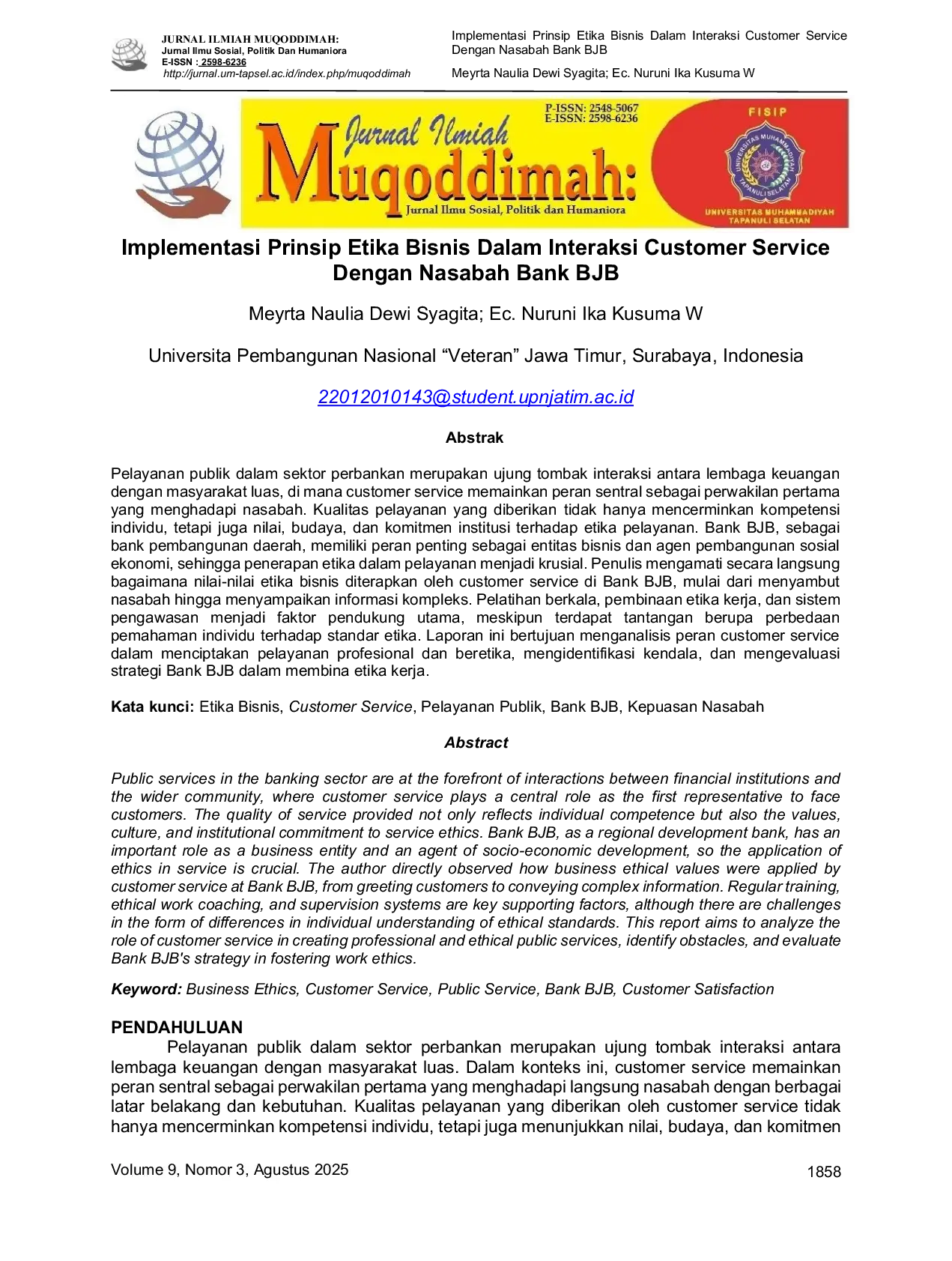 Jurnal Ilmiah Muqoddimah : Jurnal Ilmu Sosial, Politik, dan HumanioraJurnal Ilmiah Muqoddimah : Jurnal Ilmu Sosial, Politik, dan HumanioraPelayanan publik dalam sektor perbankan merupakan ujung tombak interaksi antara lembaga keuangan dengan masyarakat luas, di mana customer service memainkan peran sentral sebagai perwakilan pertama yang menghadapi nasabah. Kualitas pelayanan yang diberikan tidak hanya mencerminkan kompetensi individu, tetapi juga nilai, budaya, dan komitmen institusi terhadap etika pelayanan. Bank BJB, sebagai bank pembangunan daerah, memiliki peran penting sebagai entitas bisnis dan agen pembangunan sosial ekonomi, sehingga penerapan etika dalam pelayanan menjadi krusial. Penulis mengamati secara langsung bagaimana nilai-nilai etika bisnis diterapkan oleh customer service di Bank BJB, mulai dari menyambut nasabah hingga menyampaikan informasi kompleks. Pelatihan berkala, pembinaan etika kerja, dan sistem pengawasan menjadi faktor pendukung utama, meskipun terdapat tantangan berupa perbedaan pemahaman individu terhadap standar etika. Laporan ini bertujuan menganalisis peran customer service dalam menciptakan pelayanan profesional dan beretika, mengidentifikasi kendala, dan mengevaluasi strategi Bank BJB dalam membina etika kerja.
