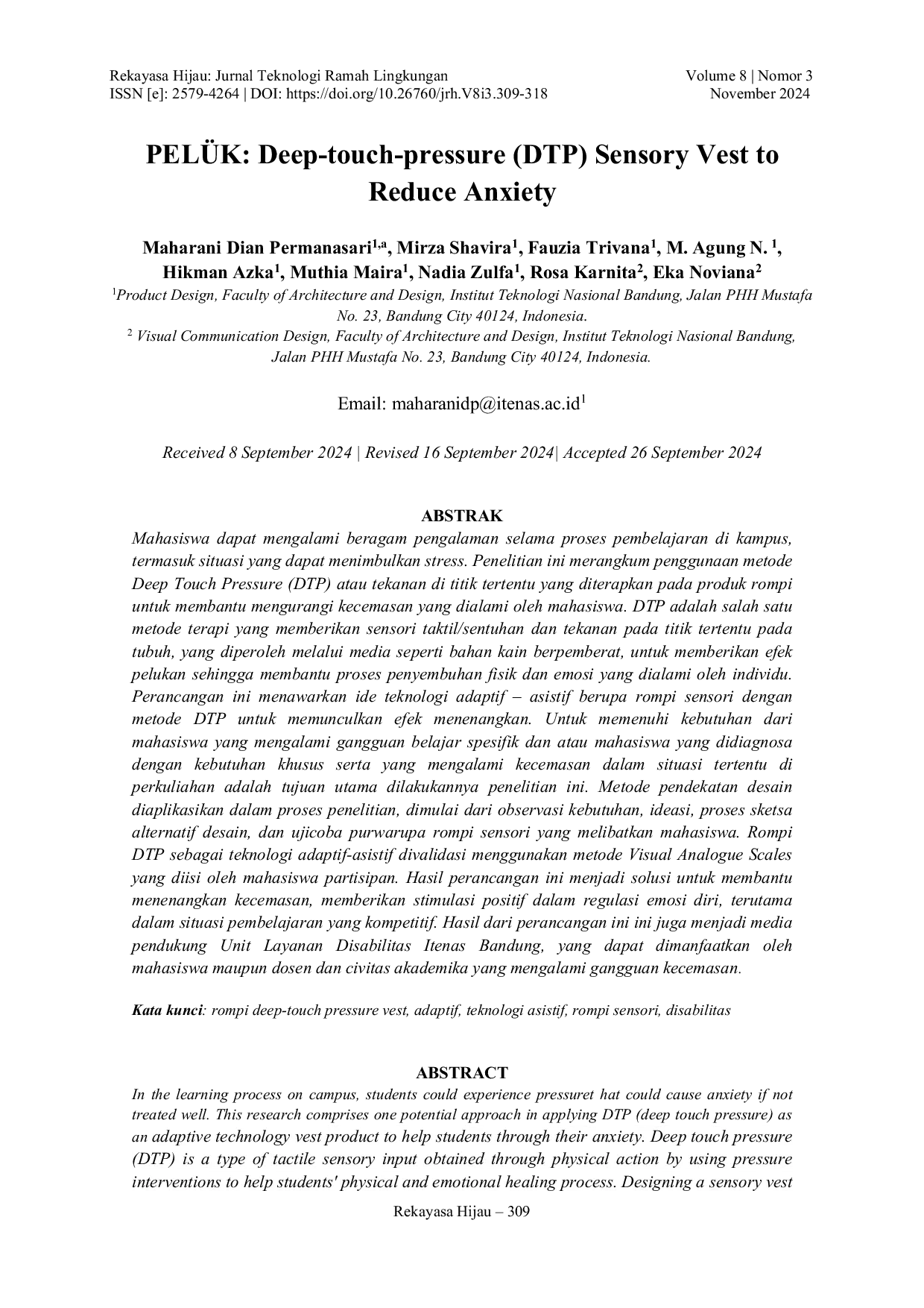 Rekayasa Hijau : Jurnal Teknologi Ramah LingkunganRekayasa Hijau : Jurnal Teknologi Ramah LingkunganMahasiswa dapat mengalami beragam pengalaman selama proses pembelajaran di kampus, termasuk situasi yang dapat menimbulkan kecemasan. Penelitian ini merangkum penggunaan metode Deep Touch Pressure (DTP) atau tekanan di titik tertentu yang diterapkan pada produk rompi untuk membantu mengurangi kecemasan yang dialami oleh mahasiswa. DTP adalah salah satu metode terapi yang memberikan sensori taktil/sentuhan dan tekanan pada titik tertentu pada tubuh, yang diperoleh melalui media seperti bahan kain berpemberat, untuk memberikan efek pelukan sehingga membantu proses penyembuhan fisik dan emosi yang dialami oleh individu. Perancangan ini menawarkan ide teknologi adaptif – asistif berupa rompi sensori dengan metode DTP untuk memunculkan efek menenangkan. Untuk memenuhi kebutuhan dari mahasiswa yang mengalami gangguan belajar spesifik dan atau mahasiswa yang didiagnosa dengan kebutuhan khusus serta yang mengalami kecemasan dalam situasi tertentu di perkuliahan adalah tujuan utama dilakukannya penelitian ini.