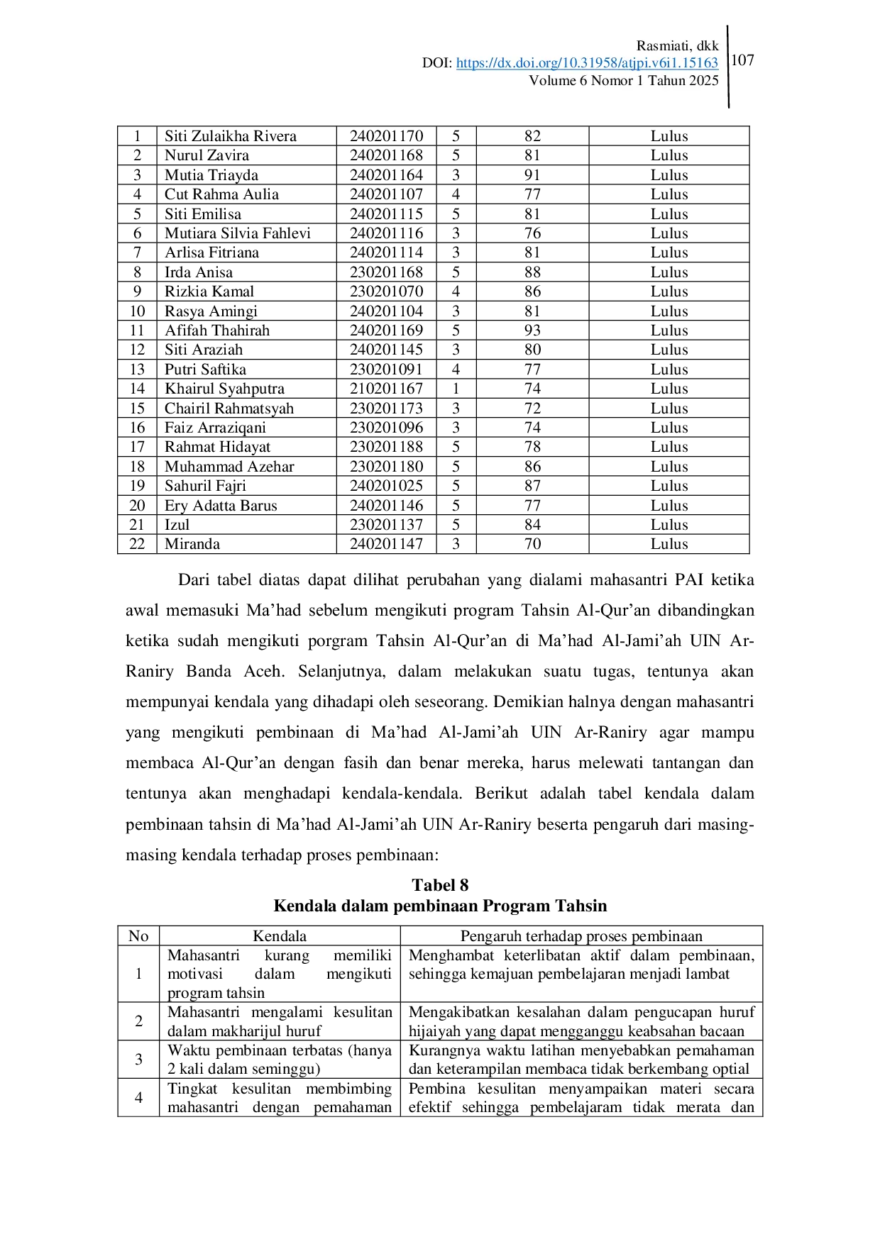 Terdapat hubungan yang signifikan antara program tahsin dan kemampuan membaca Al-Quran mahasantri PAI di Mahad Al-Jamiah UIN Ar-Raniry Banda Aceh dengan nilai korelasi sebesar 0,468, yang termasuk dalam kategori hubungan sedang.Kendala utama dalam pelaksanaan program ini berasal dari mahasantri, seperti kurangnya motivasi, kesulitan memahami makharijul huruf, serta keterbatasan waktu pembinaan yang hanya dua kali dalam seminggu.Kendala-kendala tersebut menghambat efektivitas proses pembelajaran dan peningkatan keterampilan bacaan Al-Quran.
