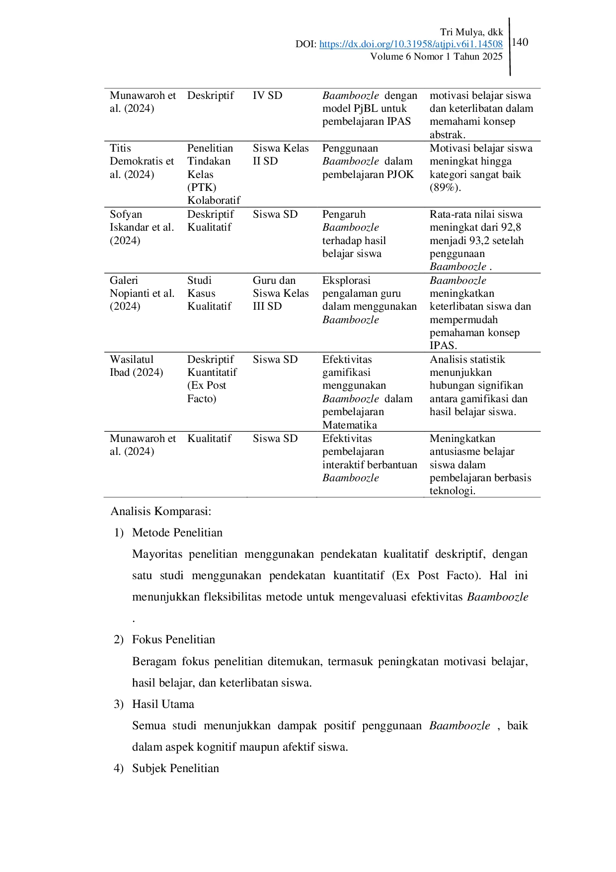 at-Tarbiyah al-Mustamirrah: Jurnal Pendidikan Islamat-Tarbiyah al-Mustamirrah: Jurnal Pendidikan IslamPenelitian ini mengkaji efektivitas penggunaan media pembelajaran Baamboozle dalam meningkatkan motivasi, partisipasi, dan hasil belajar siswa di SDIT BPMAA Pekanbaru. Dengan menggunakan metode Systematic Literature Review (SLR), penelitian ini mengumpulkan dan menganalisis data dari berbagai artikel ilmiah yang relevan. Hasil kajian menunjukkan bahwa penggunaan Baamboozle secara signifikan mampu meningkatkan motivasi belajar, keterlibatan siswa, serta hasil belajar mereka. Penelitian juga mengungkap bahwa gamifikasi dalam pembelajaran dapat menciptakan suasana yang lebih interaktif dan menyenangkan. Hal ini menjadi solusi inovatif terhadap tantangan rendahnya motivasi belajar siswa di sekolah. Selain itu, media ini menunjukkan relevansi dan adaptabilitasnya dalam konteks pendidikan berbasis Islam terpadu, seperti di SDIT BPMAA. Penelitian ini memberikan rekomendasi praktis bagi pendidik dalam mengintegrasikan teknologi pembelajaran interaktif untuk meningkatkan kualitas pendidikan.