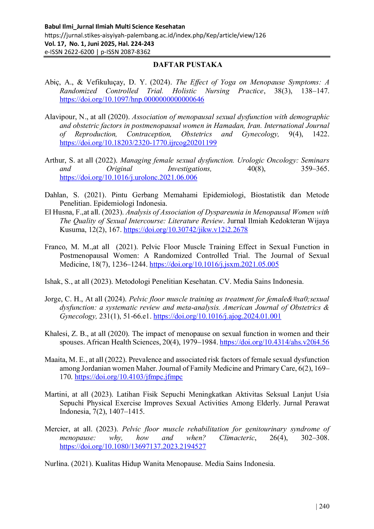 Babul Ilmi Jurnal Ilmiah Multi Science KesehatanBabul Ilmi Jurnal Ilmiah Multi Science KesehatanLatar Belakang: Menopause sering dikaitkan dengan penurunan fungsi seksual akibat perubahan hormonal yang berdampak pada lubrikasi, orgasme, dan kepuasan seksual. Pelvic Floor Physical Therapy (PFPT) menjadi salah satu intervensi non-farmakologis yang dapat membantu meningkatkan fungsi seksual pada wanita menopause. Tujuan: Mengetahui evaluasi efektivitas PFPT dalam meningkatkan skor Female Sexual Function Index (FSFI). Metode: Penelitian ini menggunakan desain eksperimen kuasi dengan pre-test dan post-test. Subjek penelitian wanita menopause usia 45–60 tahun yang mengalami disfungsi seksual, jumlah sampel 30 orang dipilih secara purposive sampling. Instrumen penelitian menggunakan FSFI mengukur fungsi seksual sebelum dan sesudah intervensi PFPT selama 4 minggu dari bulan Januari-Februari 2025 di Puskesmas Sekip Palembang. Analisis data dengan uji T berpasangan untuk melihat perbedaan skor FSFI sebelum dan setelah intervensi. Hasil: Terdapat peningkatan signifikan skor FSFI dari 24,47 ± 1,45 menjadi 39,42 ± 4,16 (p < 0,001). Peningkatan terbesar terjadi pada domain lubrikasi, orgasme, dan kepuasan seksual. PFPT efektif meningkatkan fungsi seksual wanita menopause dengan meningkatkan tonus otot panggul, aliran darah ke genitalia, serta mengurangi risiko inkontinensia urin. PFPT dapat dijadikan sebagai terapi alternatif yang aman dalam penanganan disfungsi seksual wanita menopause. Saran: Diharapkan penelitian ini dapat di implementasikan dalam kehidupan sehari-hari melakukan senam dasar panggul serta menjadi salah satu alternatif pengobatan non farmakologi dalam menurunkan disfungsi seksual wanita menopause sehingga dapat meningkatkan kualitas hidup perempuan menoupase.