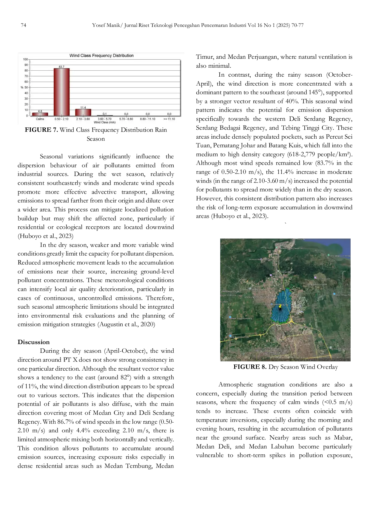 Jurnal Riset Teknologi Pencegahan Pencemaran IndustriJurnal Riset Teknologi Pencegahan Pencemaran IndustriThe iron and steel industry constitutes one of the strategic pillars of economic development. However, it is also a major contributor to global air pollution due to high-temperature fossil fuel combustion inherent in its processes. This study aims to analyze the wind characteristics surrounding a steel and iron industrial facility in North Sumatra and to predict the areas most at risk from pollutant dispersion. Meteorological data from the NASA POWER Project database, covering the period from 2021 to 2024, were processed to examine local wind profiles across two distinct seasonal periods—rainy and dry. The analysis revealed that during the rainy season, winds predominantly originated from the northwest, with moderate speeds ranging from 2.10 to 3.60 m/s, leading to pollutant dispersion mainly toward the southeast (145°, 40%). Conversely, in the dry season, wind direction was more variable, as indicated by a low resultant vector percentage (11%), suggesting multidirectional pollutant spread. Across both seasons, the majority of wind speeds were below 2.10 m/s, which limits vertical atmospheric mixing and enhances pollutant retention near the surface. Air stagnation, particularly during transitional periods between seasons and under temperature inversion conditions, further intensifies pollutant accumulation. These findings underscore the critical role of seasonal wind dynamics in air pollution behavior and provide a scientific foundation for developing effective mitigation strategies. Practical policy implications include the establishment of buffer zones in downwind residential or agricultural areas, the implementation of stricter emission controls during periods of low wind speed and stagnation, and the integration of local wind data into early warning systems for air quality. Such measures are essential to protect public health, especially in high-density areas surrounding PT X, including Medan City, Deli Serdang Regency, Serdang Bedagai Regency, and Tebing Tinggi City.