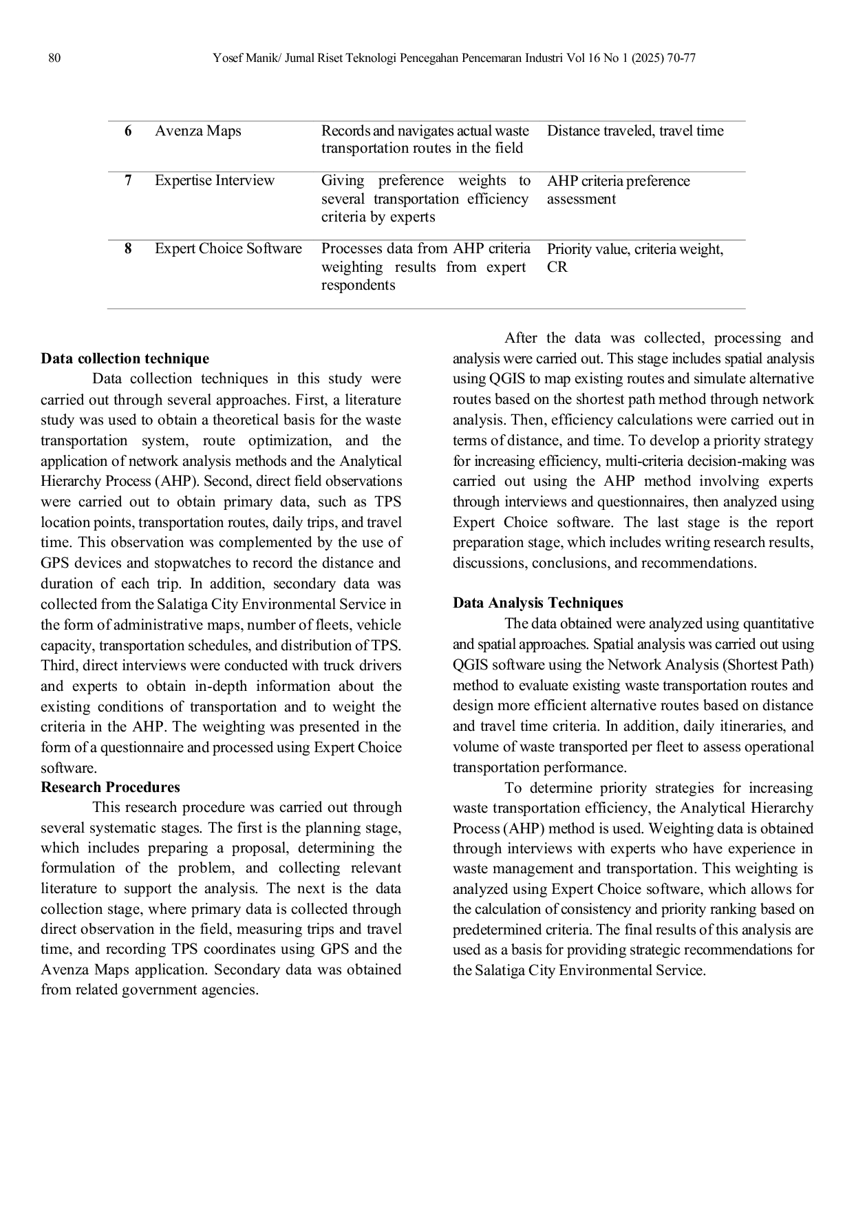 Jurnal Riset Teknologi Pencegahan Pencemaran IndustriJurnal Riset Teknologi Pencegahan Pencemaran IndustriPermasalahan transportasi sampah merupakan tantangan besar dalam pengelolaan sampah di Kota Salatiga. Dengan jumlah sampah harian yang dihasilkan mencapai 457,81 m³ dan volume yang diangkut hanya sekitar 327,33 m³, tingkat pengangkutan sampah baru mencapai 71,72%. Penelitian ini bertujuan untuk mengevaluasi dan mengoptimalkan rute pengangkutan sampah saat ini melalui pendekatan spasial menggunakan perangkat lunak QGIS. Metode yang digunakan meliputi observasi lapangan, pengumpulan data primer dan sekunder, serta analisis spasial terhadap distribusi rute dan beban kerja armada transportasi yang terdiri dari 9 unit arm roll dan 1 unit dump truck, dengan total rata-rata perjalanan harian mencapai 58 kali. Hasil perbandingan antara rute eksisting dan rute rencana menunjukkan efisiensi panjang rute harian sebesar 10,57 km (1,15%) dan efisiensi waktu operasi pengangkutan sampah selama 25 menit. Volume sampah yang diangkut juga meningkat dari 83.730 kg/hari menjadi 89.500 kg/hari (naik 6,89%), yang dicapai melalui perencanaan rute yang lebih optimal, penambahan kunjungan ke TPS Boja dan Tingkir, serta pemerataan beban kerja antar sopir. Hasil penelitian ini menegaskan bahwa optimasi rute berbasis GIS dapat meningkatkan efisiensi jarak, serta produktivitas sistem pengangkutan sampah secara keseluruhan di Kota Salatiga.