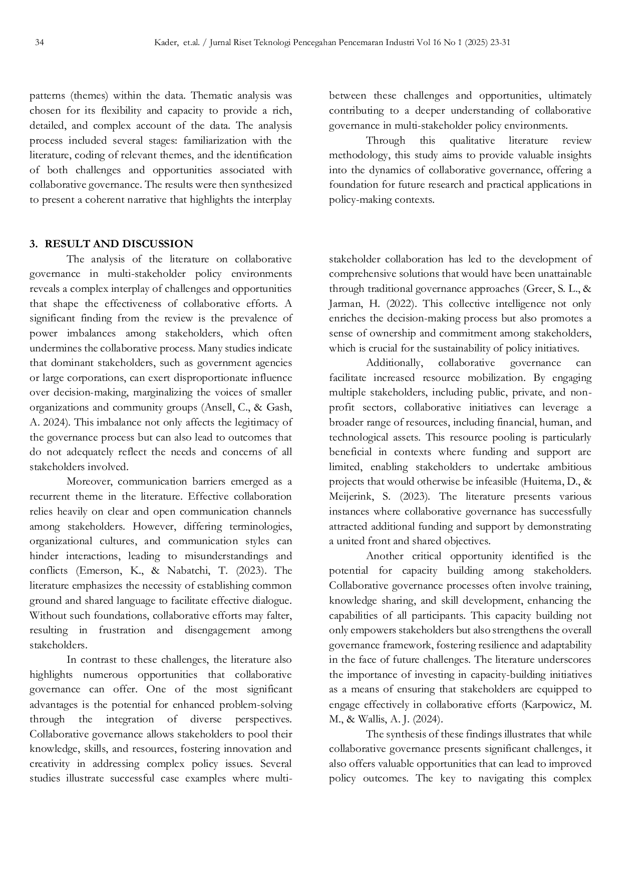 Jurnal Riset Teknologi Pencegahan Pencemaran IndustriJurnal Riset Teknologi Pencegahan Pencemaran IndustriArtikel ini menyelidiki tantangan dan peluang yang terkait dengan tata kelola kolaboratif dalam lingkungan kebijakan multi-pemangku kepentingan. Dengan menggunakan pendekatan kualitatif, kami melakukan tinjauan literatur komprehensif untuk mengidentifikasi tema kunci dan wawasan mengenai praktik tata kelola kolaboratif. Temuan menunjukkan bahwa meskipun tata kelola kolaboratif menawarkan potensi signifikan untuk meningkatkan keterlibatan pemangku kepentingan dan mendorong solusi inovatif untuk masalah kebijakan yang kompleks, hal itu juga menimbulkan tantangan yang signifikan. Tantangan-tantangan ini termasuk ketidakseimbangan kekuasaan di antara pemangku kepentingan, kesulitan dalam komunikasi dan koordinasi, serta risiko akuntabilitas yang berkurang. Sebaliknya, peluang yang diidentifikasi mencakup potensi untuk penciptaan pengetahuan bersama, peningkatan mobilisasi sumber daya, dan peningkatan hasil kebijakan melalui pengambilan keputusan kolektif. Dengan menyintesis penelitian yang ada, studi ini memberikan pemahaman yang nuansa tentang dinamika yang terjadi dalam kerangka tata kelola kolaboratif dan menekankan pentingnya mendorong partisipasi inklusif serta strategi komunikasi yang efektif. Wawasan yang diperoleh dari studi ini dapat menginformasikan pembuat kebijakan dan praktisi yang berusaha meningkatkan upaya tata kelola kolaboratif di berbagai sektor. Akhirnya, artikel ini berkontribusi pada tubuh literatur yang berkembang tentang tata kelola kolaboratif dengan menyoroti keseimbangan yang rumit antara tantangan dan peluang, sehingga menawarkan rekomendasi praktis untuk meningkatkan kolaborasi multi-pemangku kepentingan dalam lingkungan kebijakan.