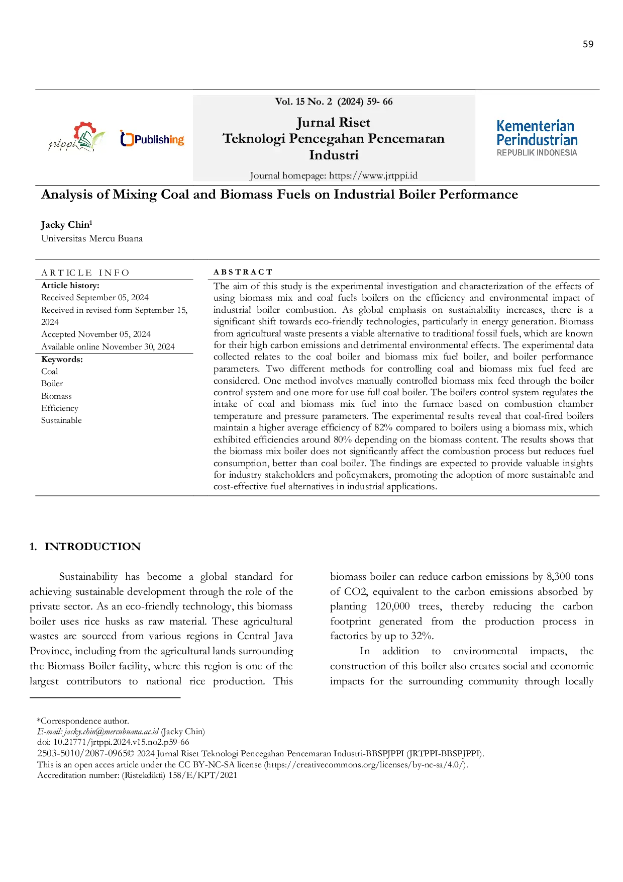 Jurnal Riset Teknologi Pencegahan Pencemaran IndustriJurnal Riset Teknologi Pencegahan Pencemaran IndustriPenelitian ini bertujuan untuk menyelidiki secara eksperimental dan mengkarakterisasi efek penggunaan campuran biomassa dan bahan bakar batu bara pada efisiensi dan dampak lingkungan dari pembakaran boiler industri. Seiring dengan meningkatnya perhatian global terhadap keberlanjutan, terdapat pergeseran signifikan menuju teknologi ramah lingkungan, terutama dalam pembangkitan energi. Biomassa dari limbah pertanian menghadirkan alternatif yang layak untuk bahan bakar fosil tradisional, yang dikenal karena emisi karbon yang tinggi dan efek lingkungan yang merugikan. Data eksperimen yang dikumpulkan berkaitan dengan boiler berbahan bakar batu bara dan boiler campuran bahan bakar biomassa, serta parameter kinerja boiler. Dua metode berbeda untuk mengendalikan pemberian makan campuran batu bara dan biomassa dipertimbangkan. Metode satu melibatkan pemberian makan campuran biomassa yang dikendalikan secara manual melalui sistem kontrol boiler dan metode lainnya untuk penggunaan boiler batu bara penuh. Sistem kontrol boiler mengatur asupan batu bara dan campuran bahan bakar biomassa ke tungku berdasarkan parameter suhu dan tekanan ruang pembakaran. Hasil eksperimen mengungkapkan bahwa boiler berbahan bakar batu bara mempertahankan efisiensi rata-rata yang lebih tinggi yaitu 82% dibandingkan dengan boiler yang menggunakan campuran biomassa, yang menunjukkan efisiensi sekitar 80% tergantung pada kandungan biomassa. Hasil penelitian menunjukkan bahwa boiler campuran biomassa tidak secara signifikan memengaruhi proses pembakaran tetapi mengurangi konsumsi bahan bakar, lebih baik dari boiler batu bara. Temuan ini diharapkan dapat memberikan wawasan berharga bagi pemangku kepentingan industri dan pembuat kebijakan, mempromosikan adopsi alternatif bahan bakar yang lebih berkelanjutan dan hemat biaya dalam aplikasi industri.