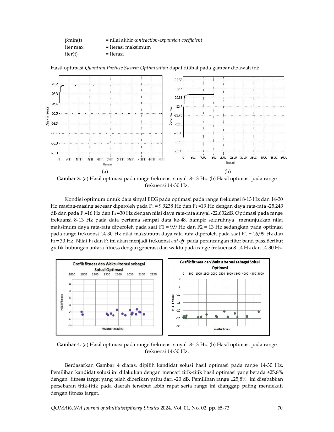 Quantum Particle Swarm Optimization mampu menemukan rentang frekuensi optimal untuk filter bandpass aktif pada sinyal EEG, yaitu 9,9 Hz hingga 13 Hz dan 15,99 Hz hingga 30 Hz, dengan nilai daya rata-rata maksimum.Rancangan filter dibuat berdasarkan hasil optimasi tersebut menggunakan nilai komponen R dan C tertentu untuk masing-masing rentang frekuensi.Karakteristik respons transien menunjukkan sistem orde dua yang stabil, dengan waktu settling masing-masing 0,394 detik dan 0,0814 detik.