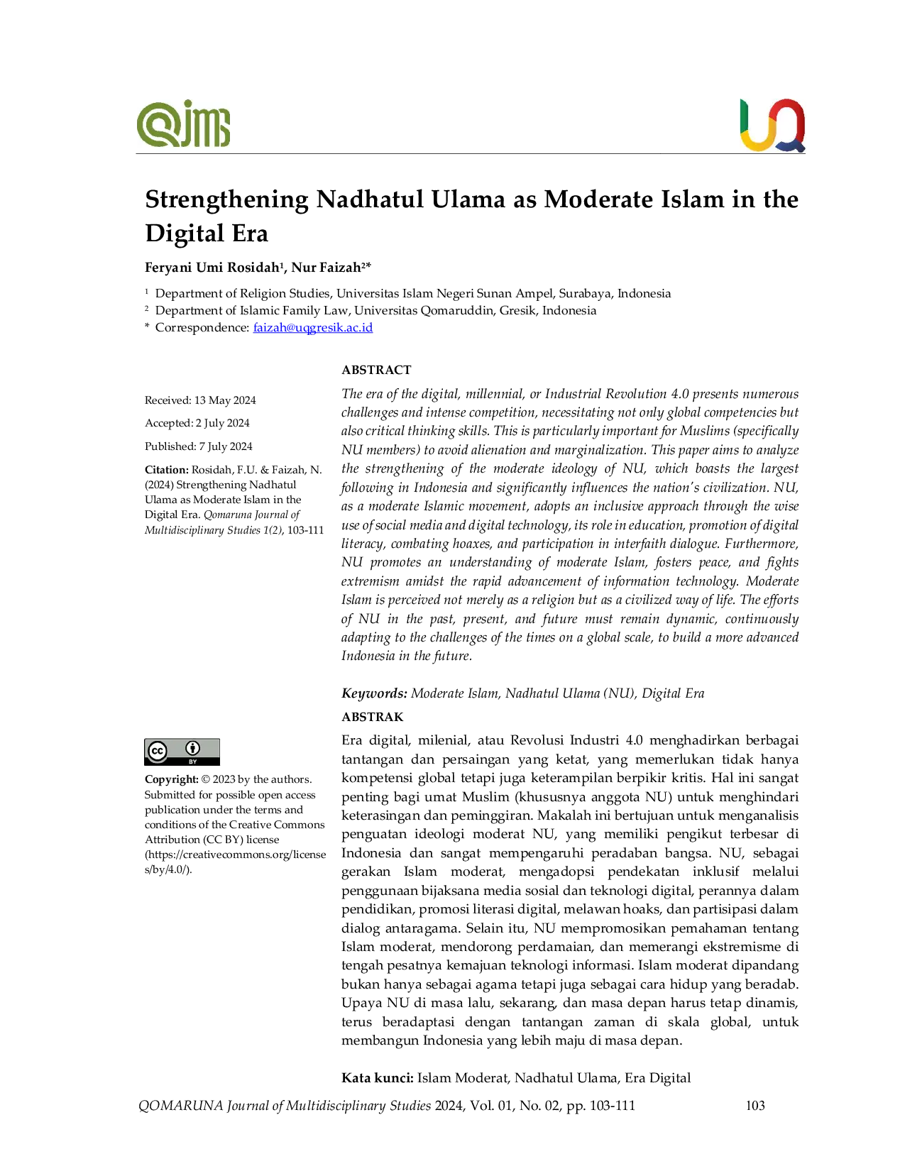 Qomaruna: Journal of Multidisciplinary StudiesQomaruna: Journal of Multidisciplinary StudiesEra digital, milenial, atau Revolusi Industri 4.0 menghadirkan berbagai tantangan dan persaingan yang ketat, yang memerlukan tidak hanya kompetensi global tetapi juga keterampilan berpikir kritis. Hal ini sangat penting bagi umat Muslim (khususnya anggota NU) untuk menghindari keterasingan dan peminggiran. Makalah ini bertujuan untuk menganalisis penguatan ideologi moderat NU, yang memiliki pengikut terbesar di Indonesia dan sangat mempengaruhi peradaban bangsa. NU, sebagai gerakan inklusif melalui penggunaan bijaksana media sosial dan teknologi digital, perannya dalam pendidikan, promosi literasi digital, melawan hoaks, dan partisipasi dalam dialog antaragama. Selain itu, NU mempromosikan pemahaman tentang Islam moderat, mendorong perdamaian, dan memerangi ekstremisme di tengah pesatnya kemajuan teknologi informasi. Islam moderat dipandang bukan hanya sebagai agama tetapi juga sebagai cara hidup yang beradab. Upaya NU di masa lalu, sekarang, dan masa depan harus tetap dinamis, terus beradaptasi dengan tantangan zaman di skala global, untuk membangun Indonesia yang lebih maju di masa depan.