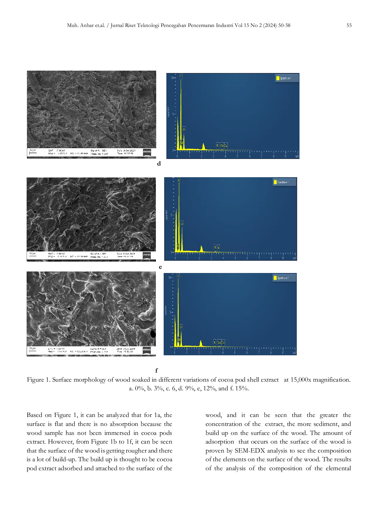 Pengawetan kayu mahoni dengan variasi konsentrasi ekstrak kulit buah kakao 0%, 3%, 6%, 9%, 12%, dan 15% melalui perendaman dingin selama 120 jam telah berhasil meningkatkan sifat mekanis kayu.Nilai kadar air, retensi, dan sifat mekanis kayu meningkat seiring dengan peningkatan konsentrasi ekstrak.Peningkatan tertinggi diperoleh pada konsentrasi 15% dengan nilai retensi, kuat lentur, dan kuat tekan sejajar serat masing-masing 7,6078 kg/m², 387,82 kg/m², dan 227,92 kg/m².