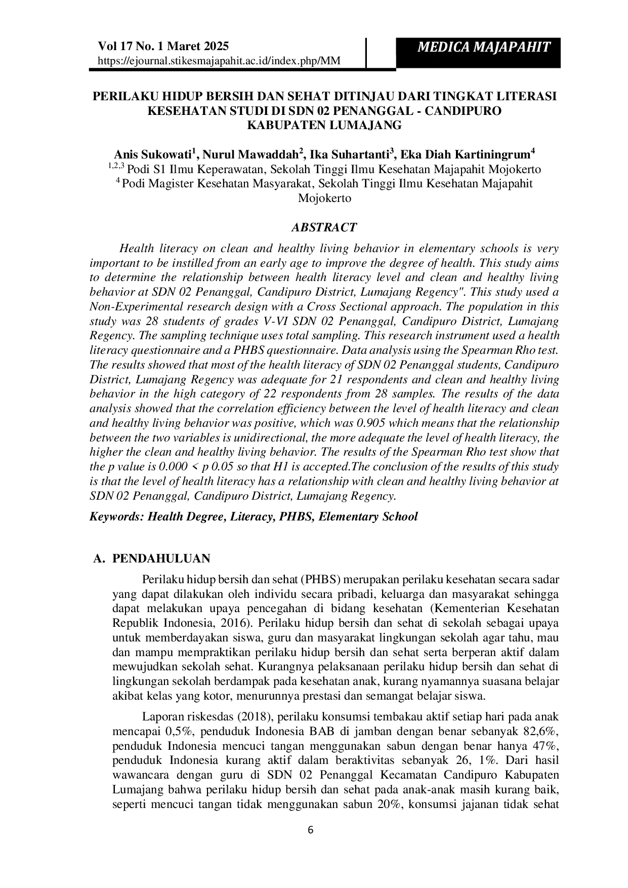 MEDICA MAJAPAHITMEDICA MAJAPAHITLiterasi kesehatan pada perilaku hidup bersih dan sehat di sekolah dasar sangat penting untuk ditanamkan sejak dini guna meningkatkan derajat kesehatan. Penelitian ini bertujuan untuk mengetahui hubungan antara tingkat literasi kesehatan dengan perilaku hidup bersih dan sehat di SDN 02 Penanggal, Candipuro, Lumajang. Penelitian menggunakan desain non-eksperimental dengan pendekatan cross-sectional. Populasi penelitian adalah 28 siswa kelas V-VI SDN 02 Penanggal. Hasil penelitian menunjukkan bahwa sebagian besar siswa memiliki literasi kesehatan yang memadai dan perilaku hidup bersih dan sehat yang tinggi. Analisis data menggunakan uji Spearman Rho menunjukkan korelasi positif antara tingkat literasi kesehatan dan perilaku hidup bersih dan sehat, dengan nilai koefisien korelasi 0,905. Kesimpulan penelitian ini adalah terdapat hubungan antara tingkat literasi kesehatan dengan perilaku hidup bersih dan sehat di SDN 02 Penanggal, Candipuro, Lumajang.