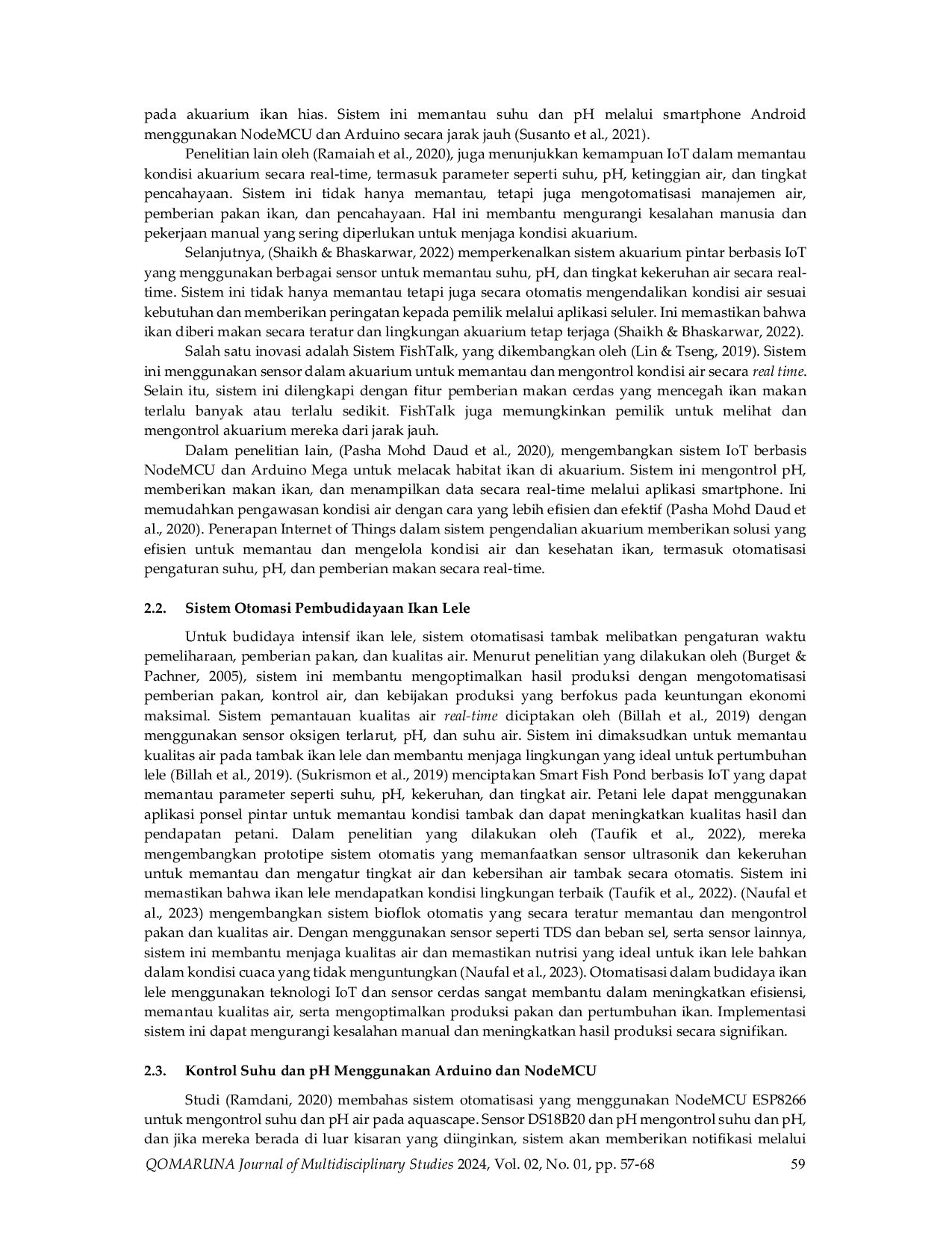 Qomaruna: Journal of Multidisciplinary StudiesQomaruna: Journal of Multidisciplinary StudiesBudidaya ikan lele dumbo memerlukan manajemen kualitas air yang optimal untuk memastikan pertumbuhan benih yang sehat. Parameter penting yang harus diperhatikan adalah suhu dan pH air, karena ketidakseimbangan dapat berdampak negatif pada kesehatan dan pertumbuhan ikan. Penelitian ini bertujuan merancang dan membangun prototipe sistem pemantauan kualitas air berbasis Internet of Things (IoT) menggunakan Arduino UNO dan NodeMCU. Dalam proses pembudidayaan yang ideal, kadar keasaman (pH) air ideal adalah 6-9, dan suhu air ideal adalah 26–30 °C. Dengan menggunakan Arduino UNO dan NodeMcu berbasis IoT (Internet of Things), pembudidaya dapat lebih mudah mengontrol suhu dan melacak pH air dalam aquarium pembenihan benih ikan lele dumbo. Arduino digunakan sebagai mikrokontroler dan modul wifi NodeMCU untuk menghubungkan mikrokontroler ke blynk sebagai interface. Suhu dikontrol dengan pemanas air dan elemen peltier. Hasil pengujian menunjukkan bahwa sistem mampu menjaga suhu rata-rata 26 °C dan pH rata-rata 6, sesuai dengan hasil pengukuran manual menggunakan termometer air dan kertas lakmus. Sistem pemanas dan pendingin bekerja secara optimal, dengan waktu tunda rata-rata sebesar 13,5884298 milidetik, yang jauh lebih kecil dari ambang batas 150 milidetik. Dengan demikian, sistem ini dapat berfungsi dengan baik dan memudahkan pembudidaya dalam memantau dan mengontrol kualitas air akuarium secara real-time.