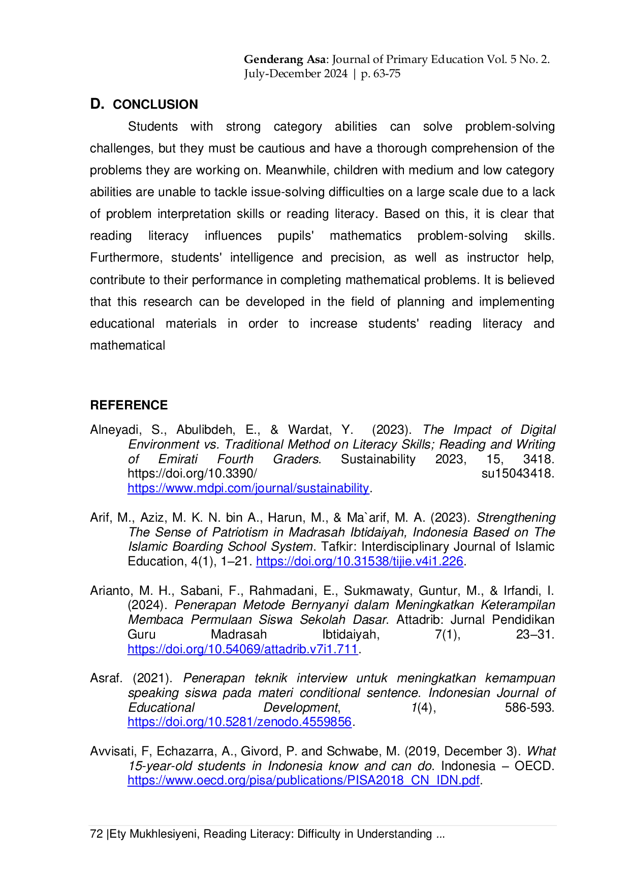 Siswa dengan kemampuan kategori tinggi mampu memahami dan menyelesaikan soal pemecahan masalah, namun tetap memerlukan ketelitian dan pemahaman mendalam terhadap permasalahan.Siswa dengan kemampuan kategori sedang dan rendah belum mampu menyelesaikan soal secara menyeluruh karena terkendala dalam memahami makna soal akibat rendahnya literasi membaca.Oleh karena itu, literasi membaca secara signifikan memengaruhi kemampuan pemecahan masalah matematis siswa, yang juga dipengaruhi oleh kecerdasan, ketelitian, serta dukungan guru dalam pembelajaran.