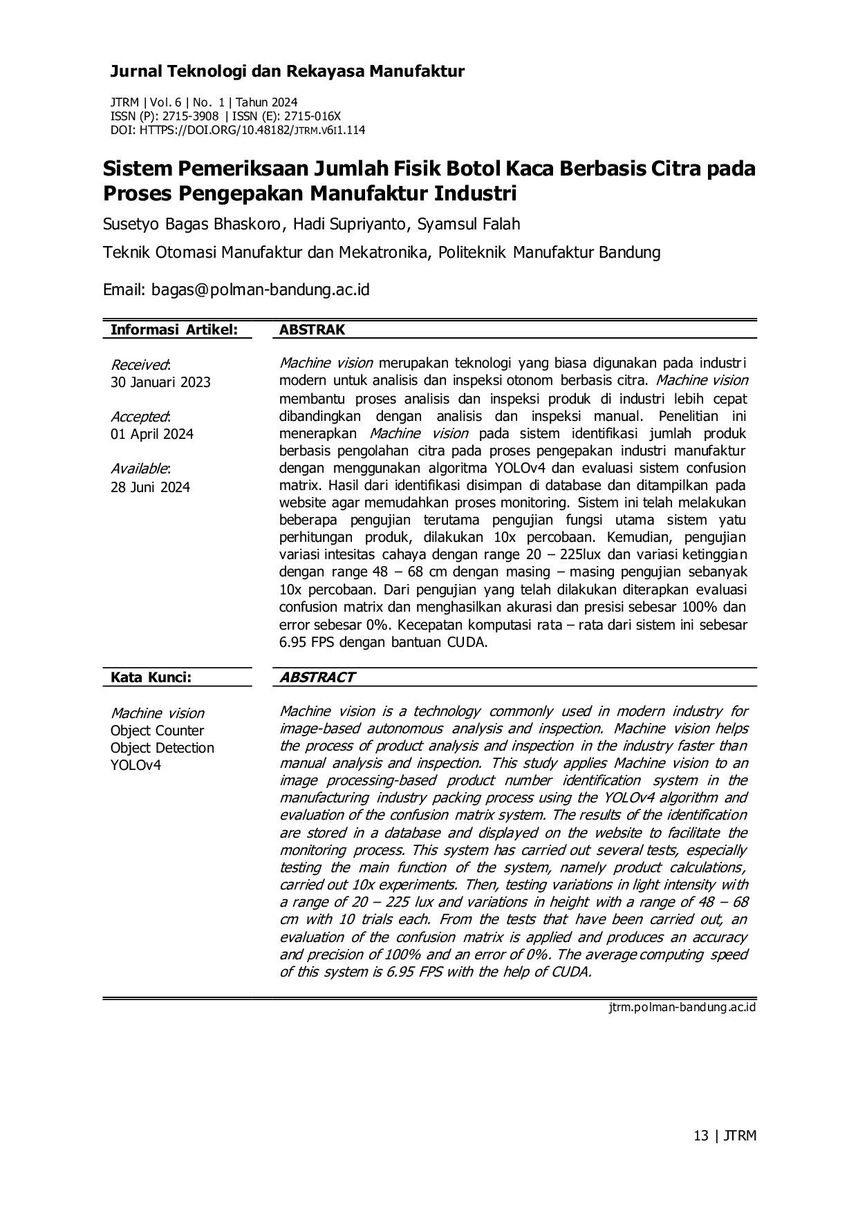 - JTRM (Jurnal Teknologi dan Rekayasa Manufaktur). sistem identifikasi produk pengolahan algoritma yolo... DOI.ORG/10.48182/JTRM.V6I1.114JTRM Jurnal Teknologi dan Rekayasa Manufaktur sistem identifikasi produk pengolahan algoritma yolo DOI ORG 10 48182 JTRM V6I1 114